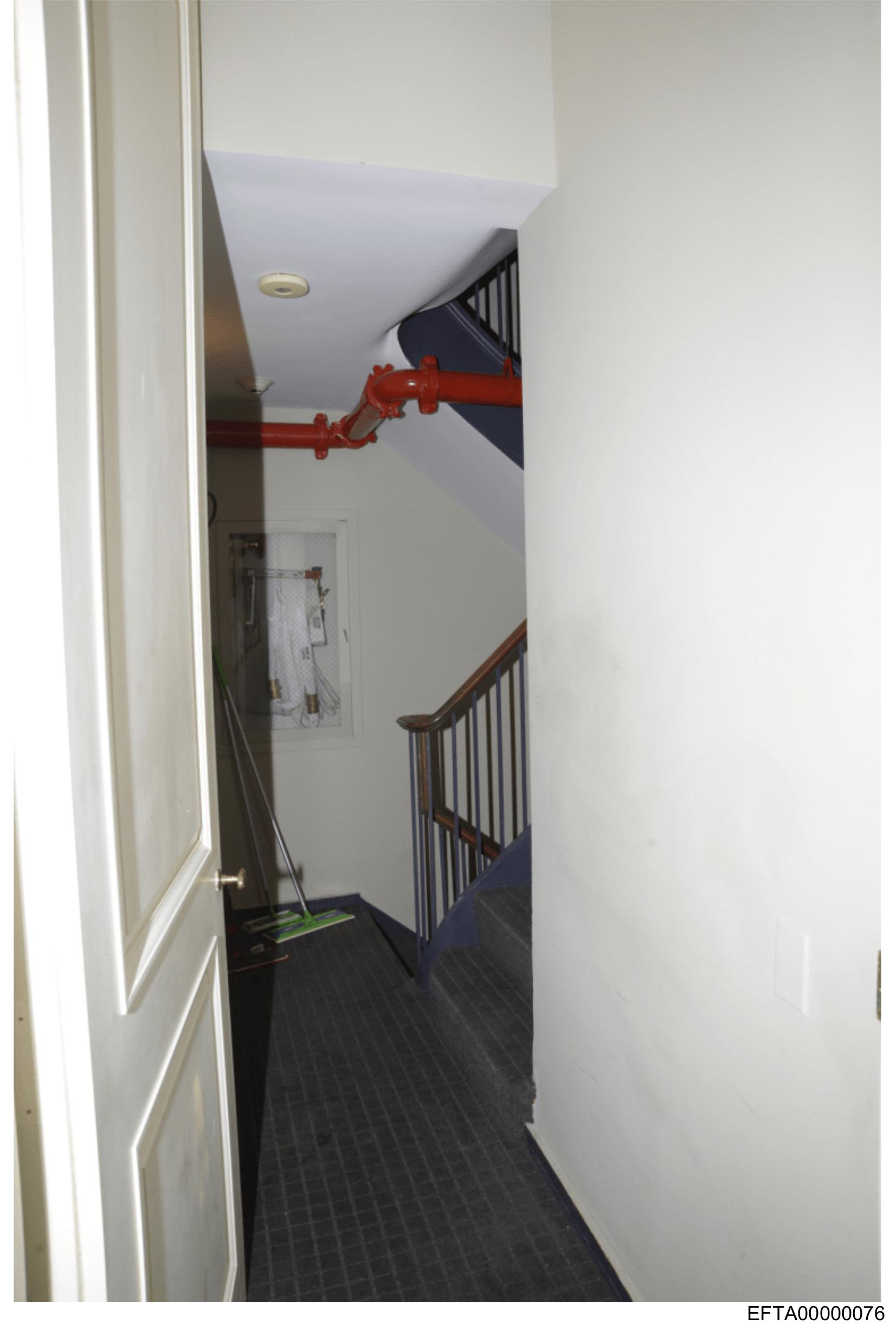 The image shows an interior space with a narrow hallway leading to a staircase.