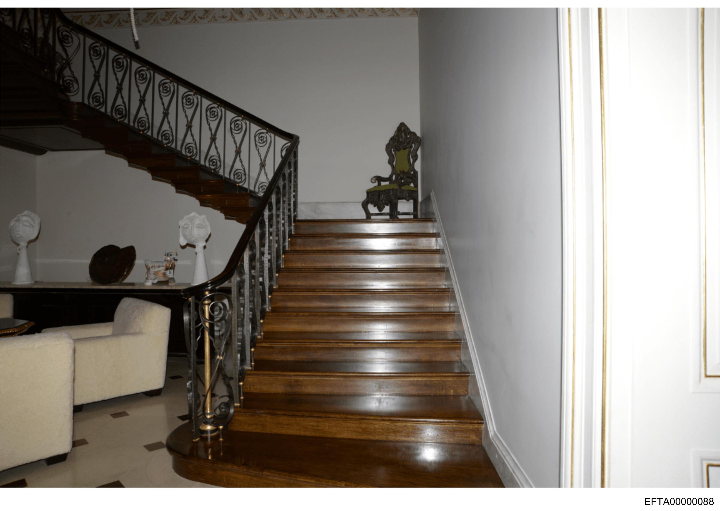 The image shows an interior staircase with a wooden banister and dark-toned hardwood steps.