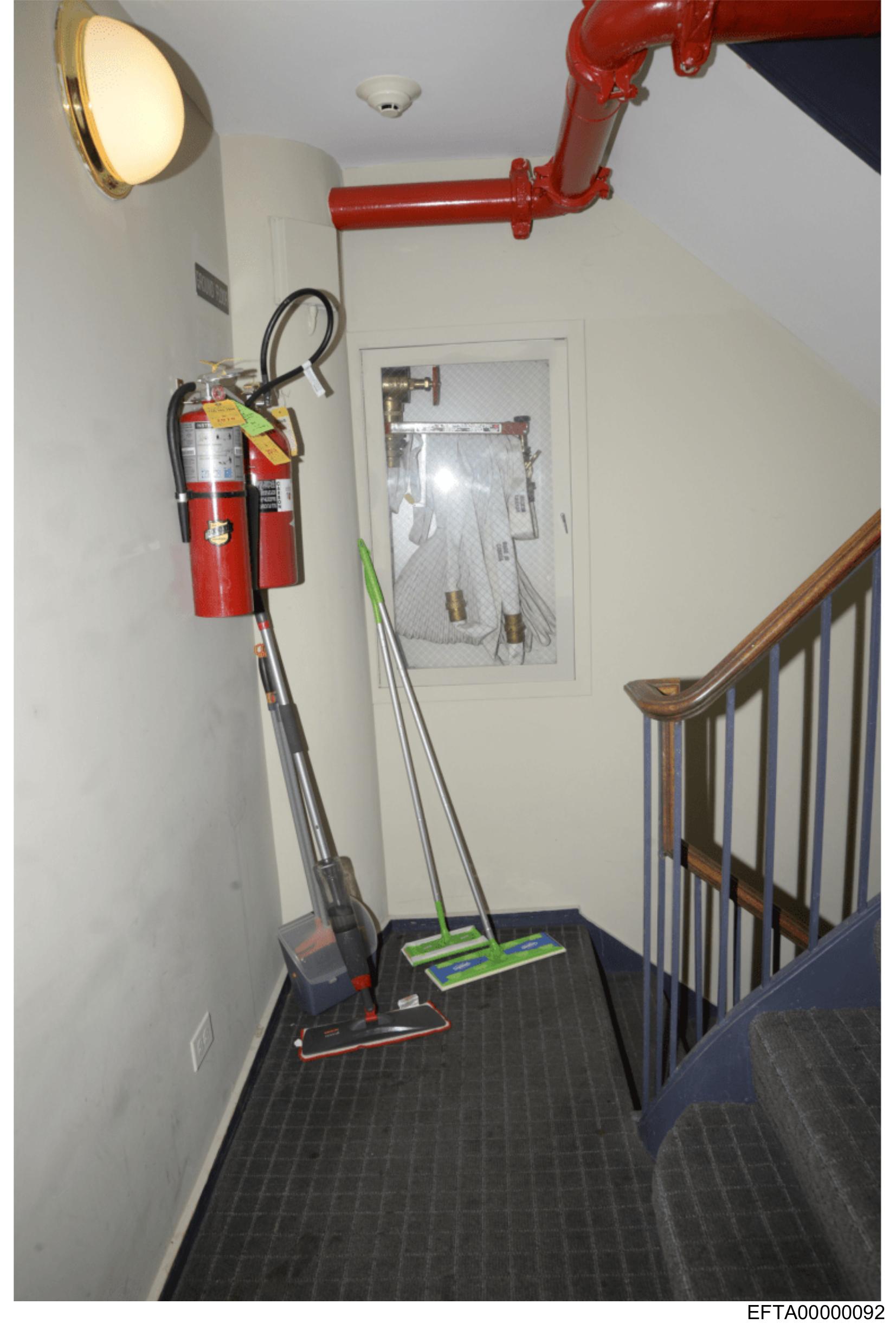 The image depicts the interior of a building stairwell. On the left side of the staircase, there is a red fire extinguisher mounted on the wall. Above it, there are two yellow pipes running along the ceiling. The floor appears to be tiled, and on the right side of the photo, there's a blue railing for safety purposes when ascending or descending the stairs. There are no visible texts, people, or locations that can be discerned from this image alone, and it seems to focus primarily on the objects related to fire safety and stairwell accessibility.