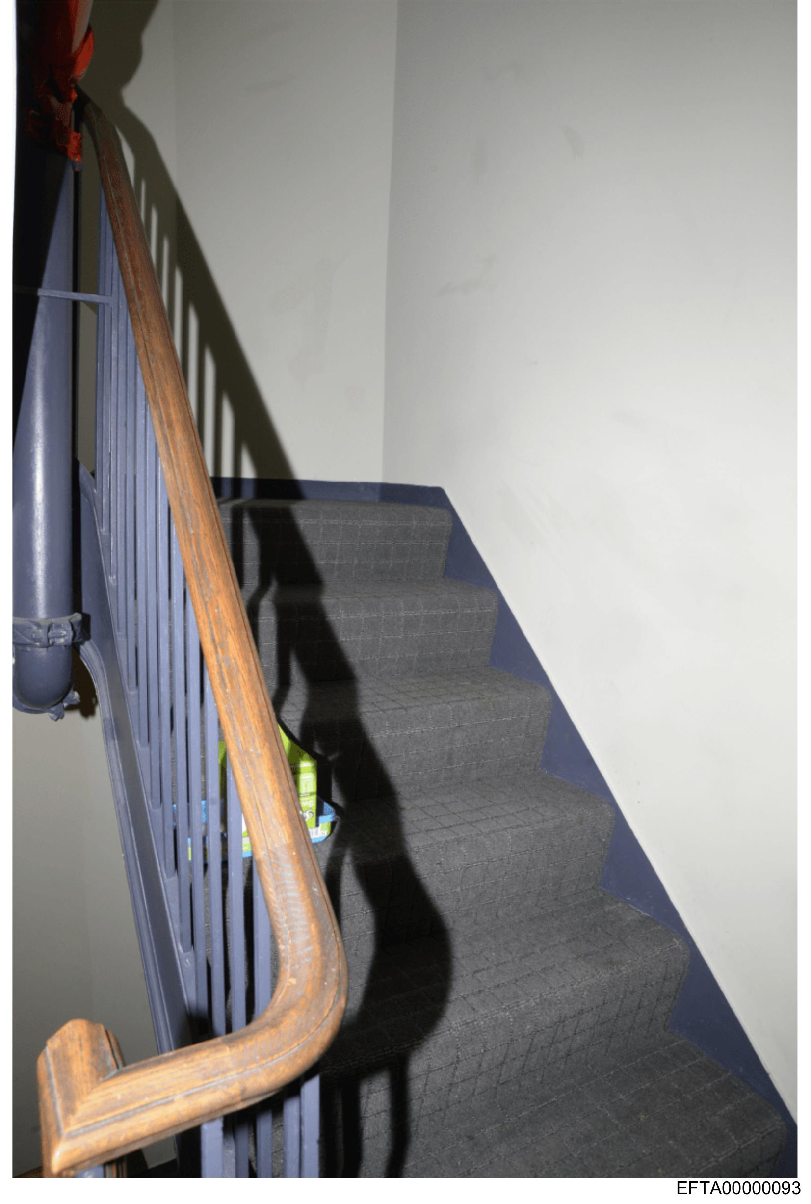 The image shows a staircase with a wooden handrail.