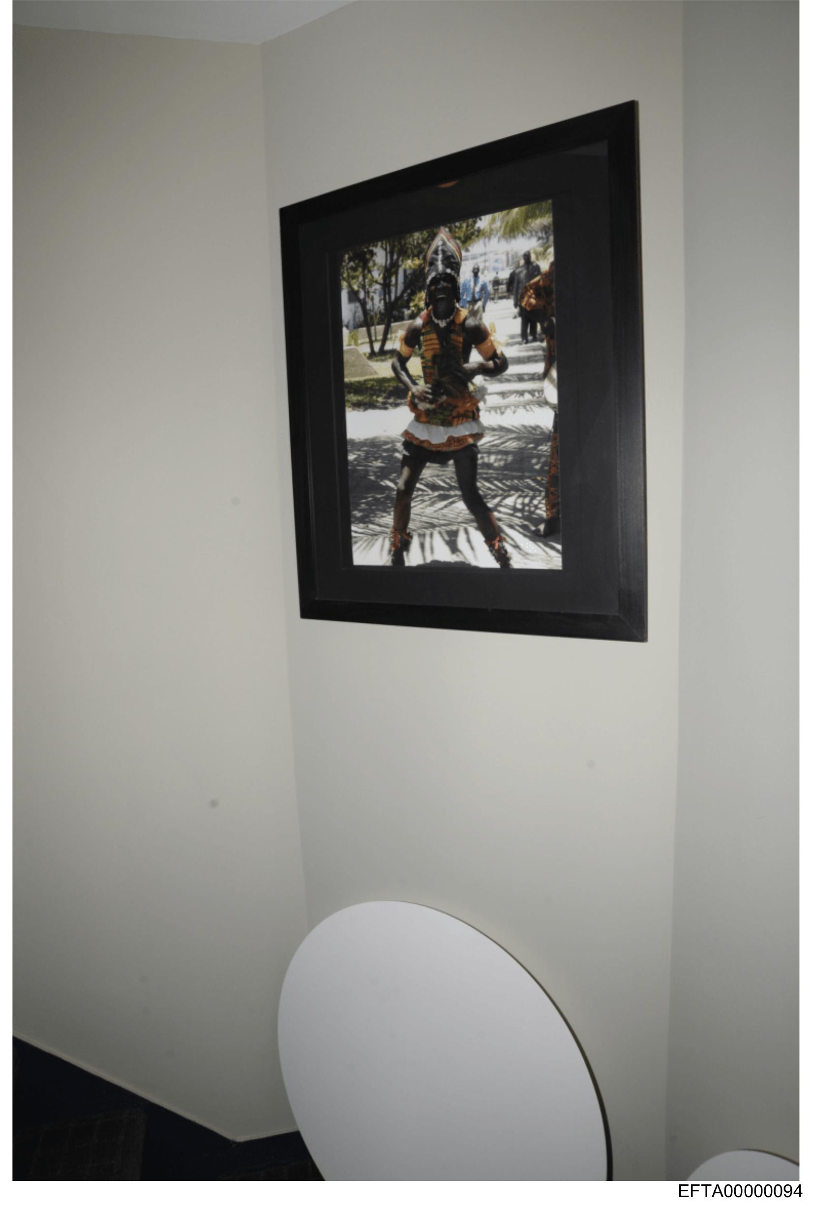 The image depicts a framed photograph hung on the wall above a toilet bowl, which is partially visible at the bottom of the frame.