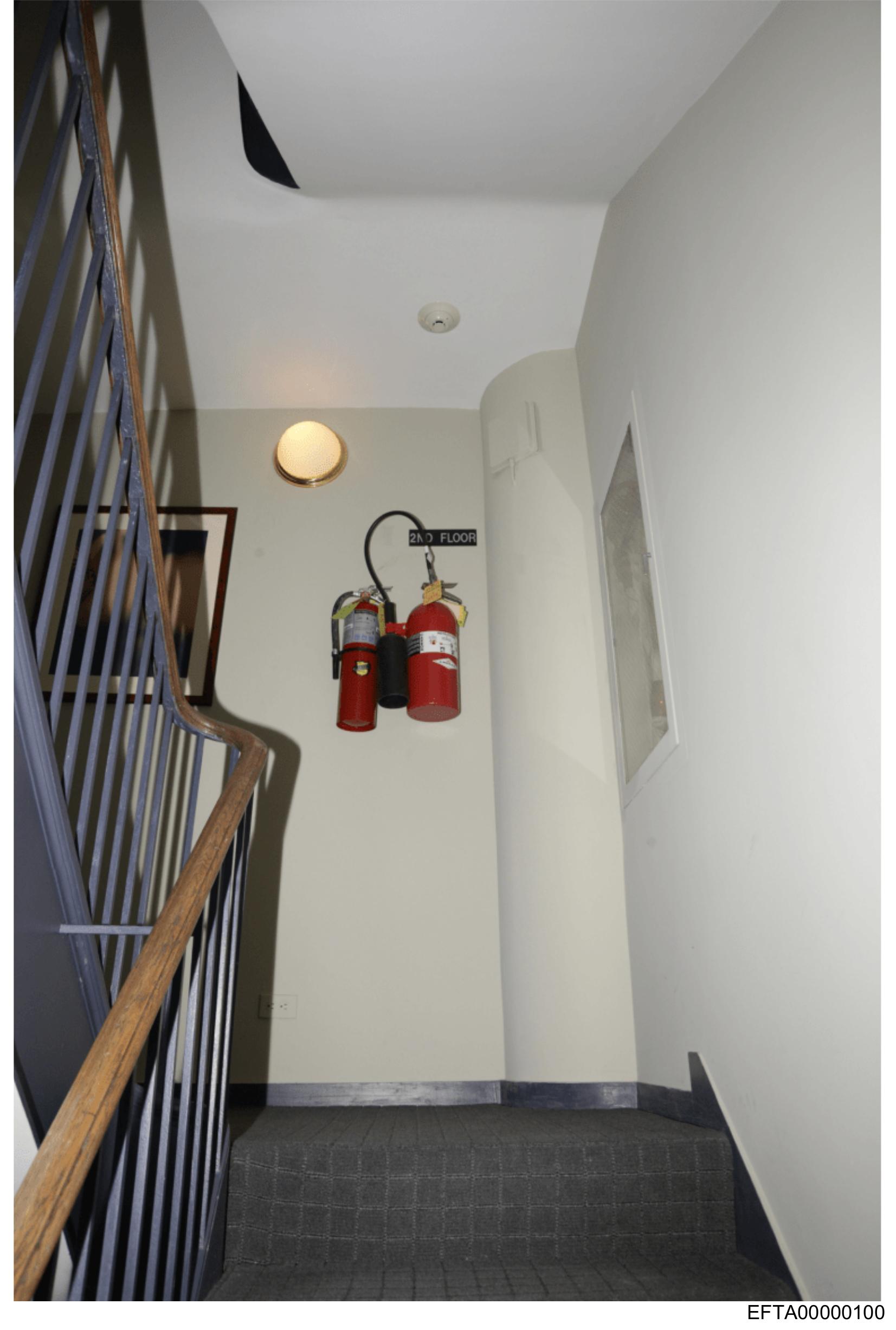The image shows an interior space with a staircase leading up to a doorway. To the right of the stairs is a red fire extinguisher mounted on the wall. There is no visible text in the image. The style appears to be candid, possibly taken without staging or professional lighting. The architecture suggests this could be part of a building such as an office or apartment complex, but there are no distinct features that would provide more specific information about the location.