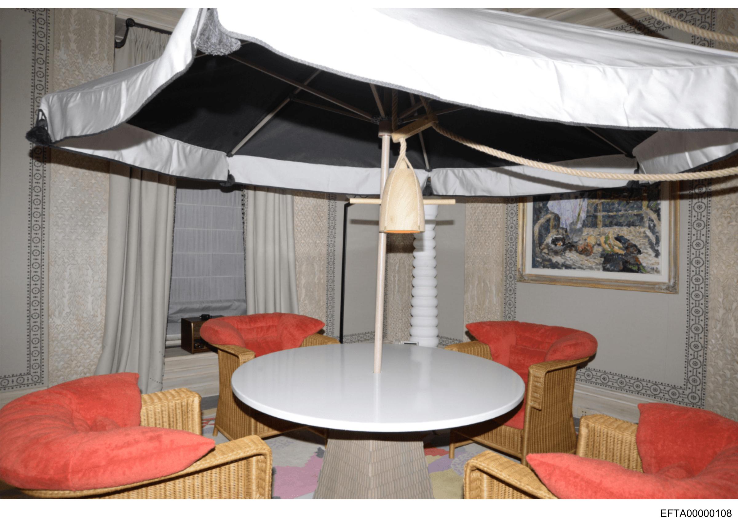 The image shows an indoor setting with a large central table surrounded by red chairs. On top of the table is a lamp made to resemble a traditional tent or umbrella structure, featuring poles and fabric panels that create a dome-like silhouette. In the background, there's a room decorated with curtains and a framed piece of art on the wall. The text visible in the image reads "ETXO 2015" which could indicate an event or exhibition related to this setting. The overall style of the image is photographic, capturing a real-life scene rather than artistic representation.