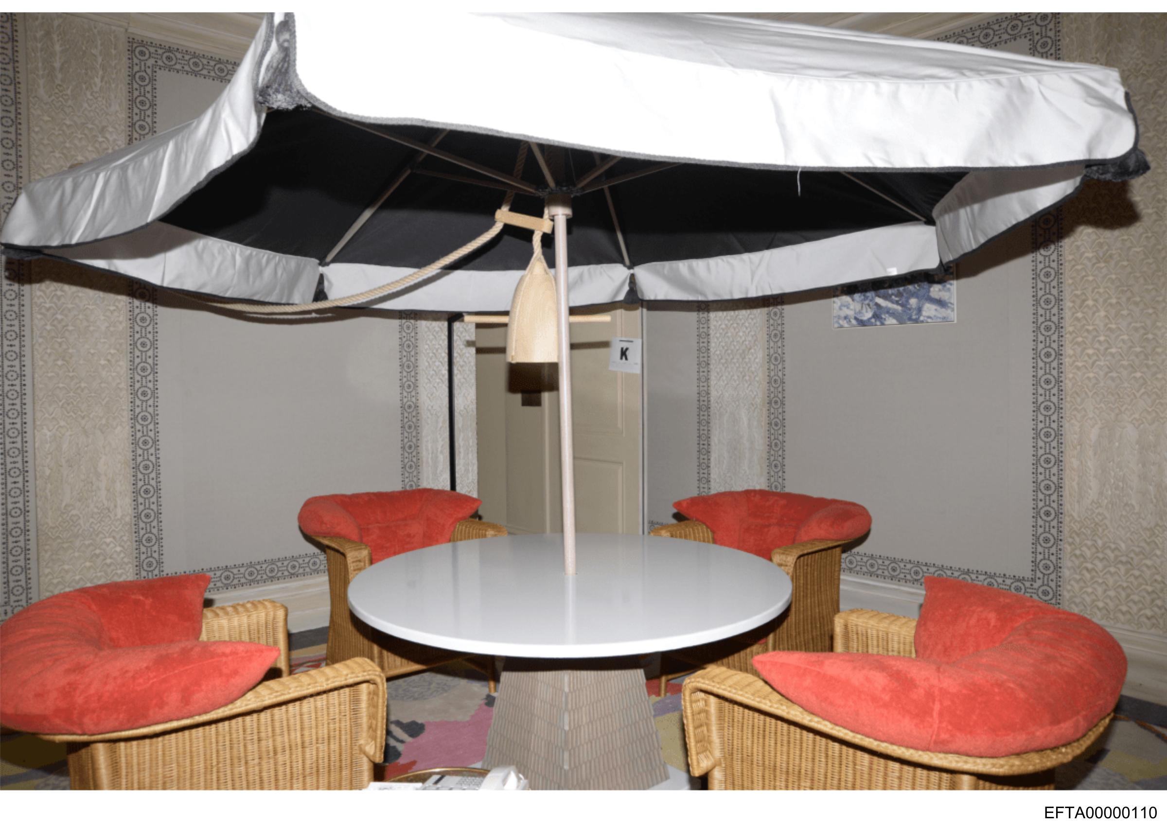 The image shows an indoor setting with a large central dining table surrounded by red cushioned chairs.