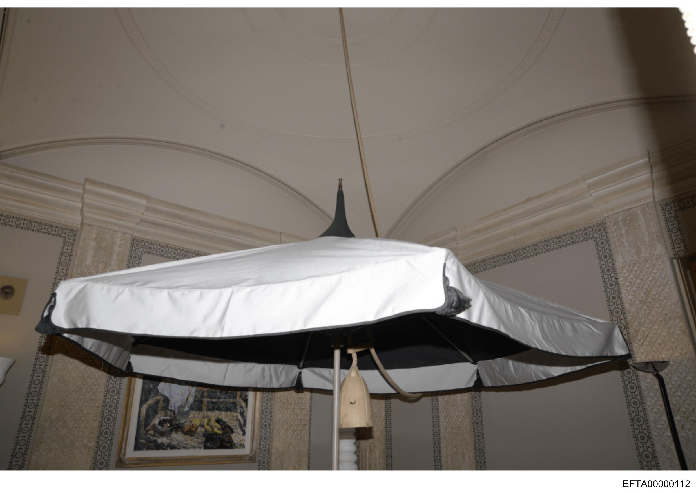 The image shows an overhead view of a room with high ceilings and decorative architectural features.