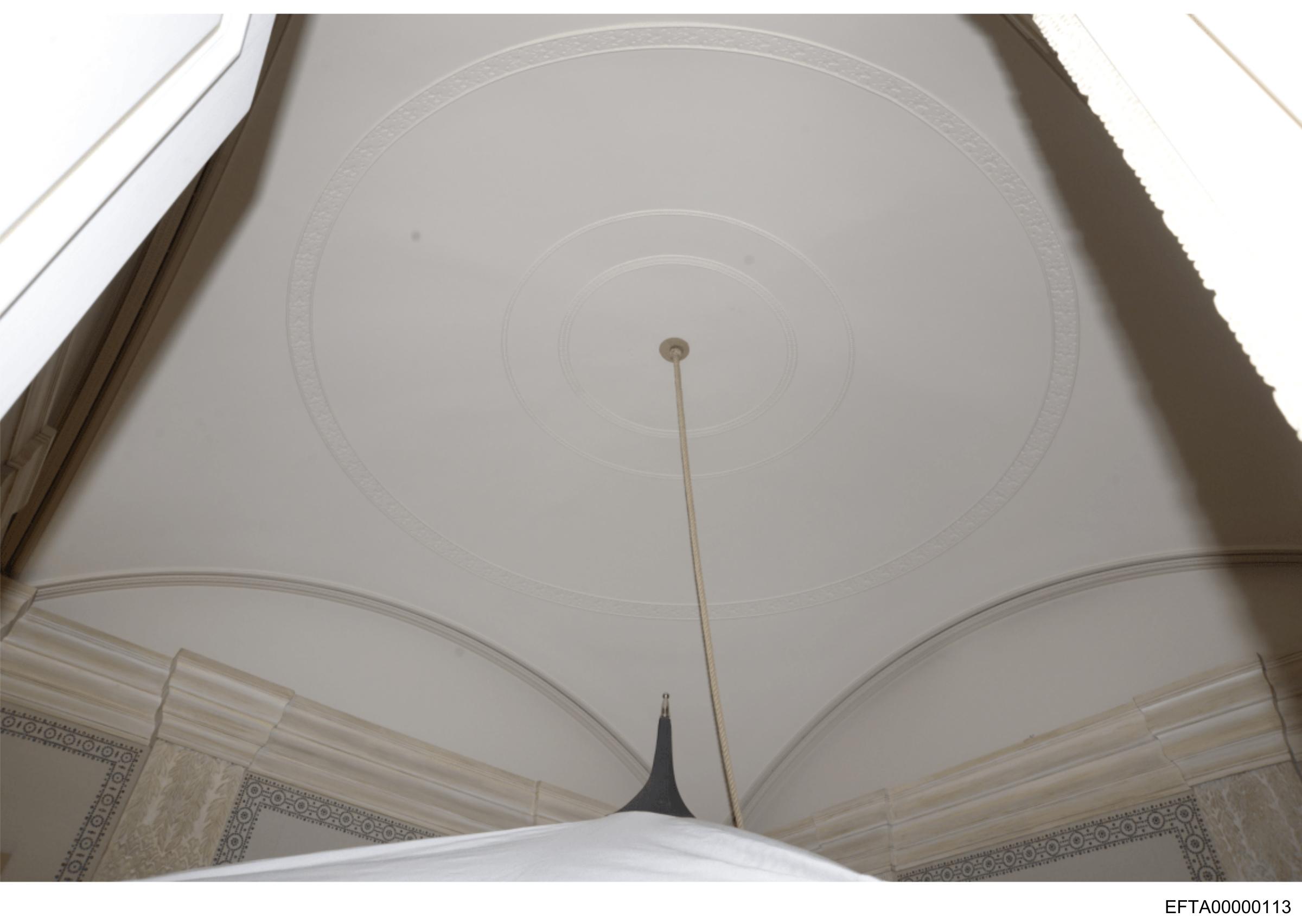 This is a vertical image showing an overhead view of what appears to be the interior of a building with a distinctive architectural feature. The ceiling has a circular pattern centered around a central light fixture that resembles a compass rose, often associated with navigation and seafaring themes. There are no texts or people visible in the image, and it's difficult to determine the exact location without additional context. The photograph is slightly blurred, especially at the edges, which could be due to camera shake or low lighting conditions.