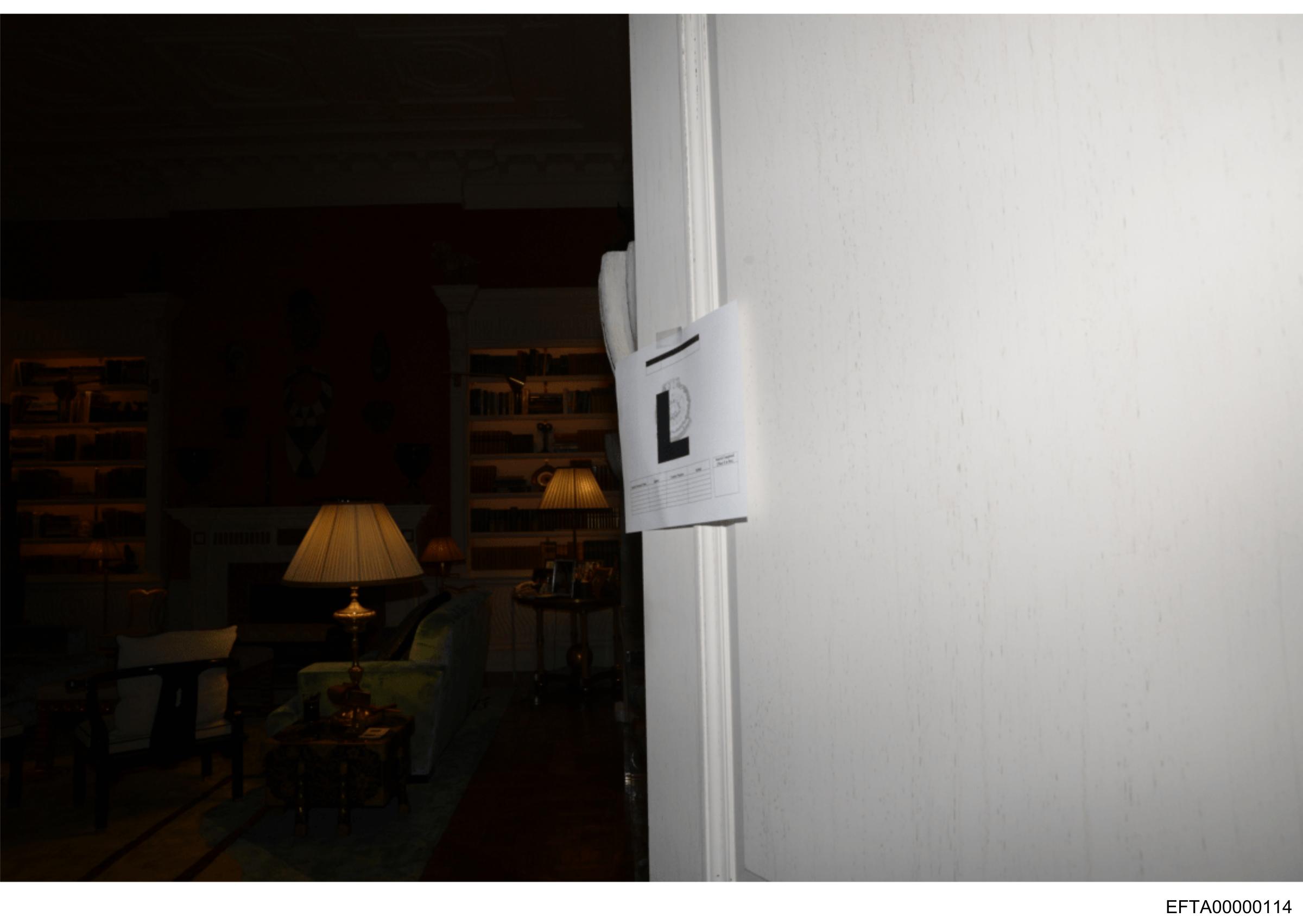 The image displays an interior scene featuring a closed door with what appears to be a label or sign attached to it. The door is framed by woodwork and sits within an entrance area that suggests a residential setting. To the left of the door, there's a glimpse of a room with shelving holding various items, possibly books or decorative objects. There are two lines in red text superimposed over the image at the top and bottom; however, they are partially obscured and do not provide clear information about their content. The overall quality of the photo is blurry and lacks sharpness, making it difficult to discern fine details.