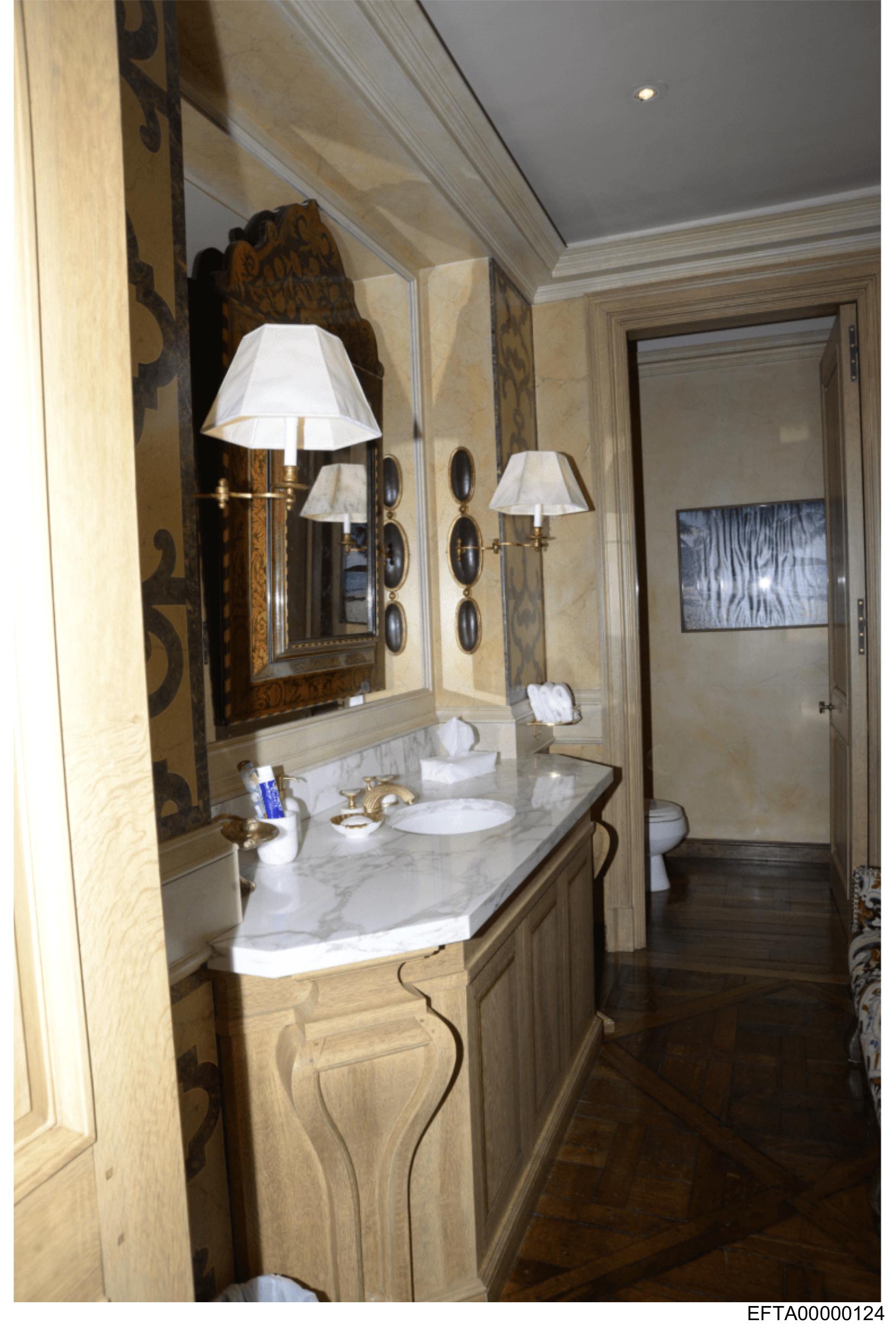 The image shows an elegant bathroom interior with a marble countertop and cabinets that feature a carved design, possibly inspired by Art Deco style.