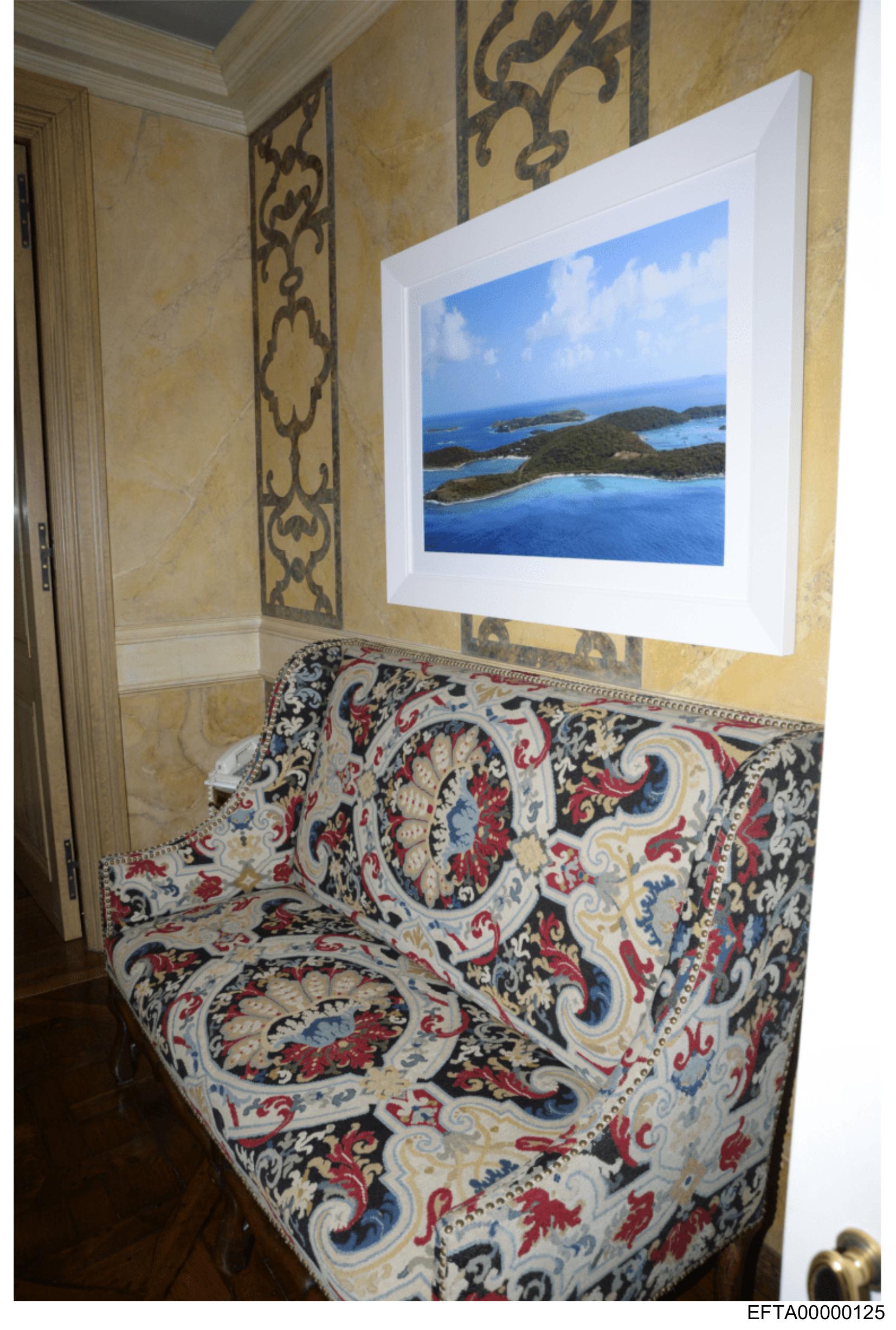 The image shows an interior room with a prominent wall adorned with a framed painting featuring a seascape with blue water and islands under a clear sky.