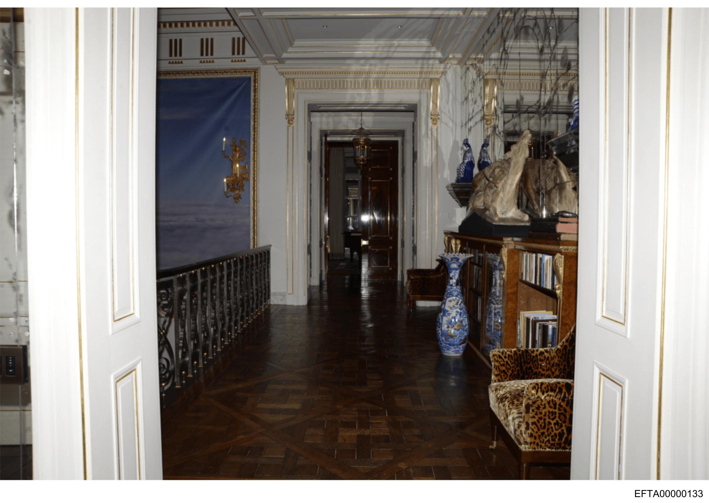 The image is a photograph of an interior space that appears to be a hallway or corridor. The walls are adorned with intricate moldings and frames, giving the space a classic and formal aesthetic. There's a large painting hanging above what seems to be a doorway at the end of the hall. The floor has a patterned design and is polished, reflecting some of the light in the room. To the right, there is a partial view of a seating arrangement with plush cushions, suggesting a comfortable seating area within this formal space. No people are visible in the image. The photograph has a watermark or logo at the bottom that reads "ETX 2019," indicating the possible source or photographer associated with the image.
