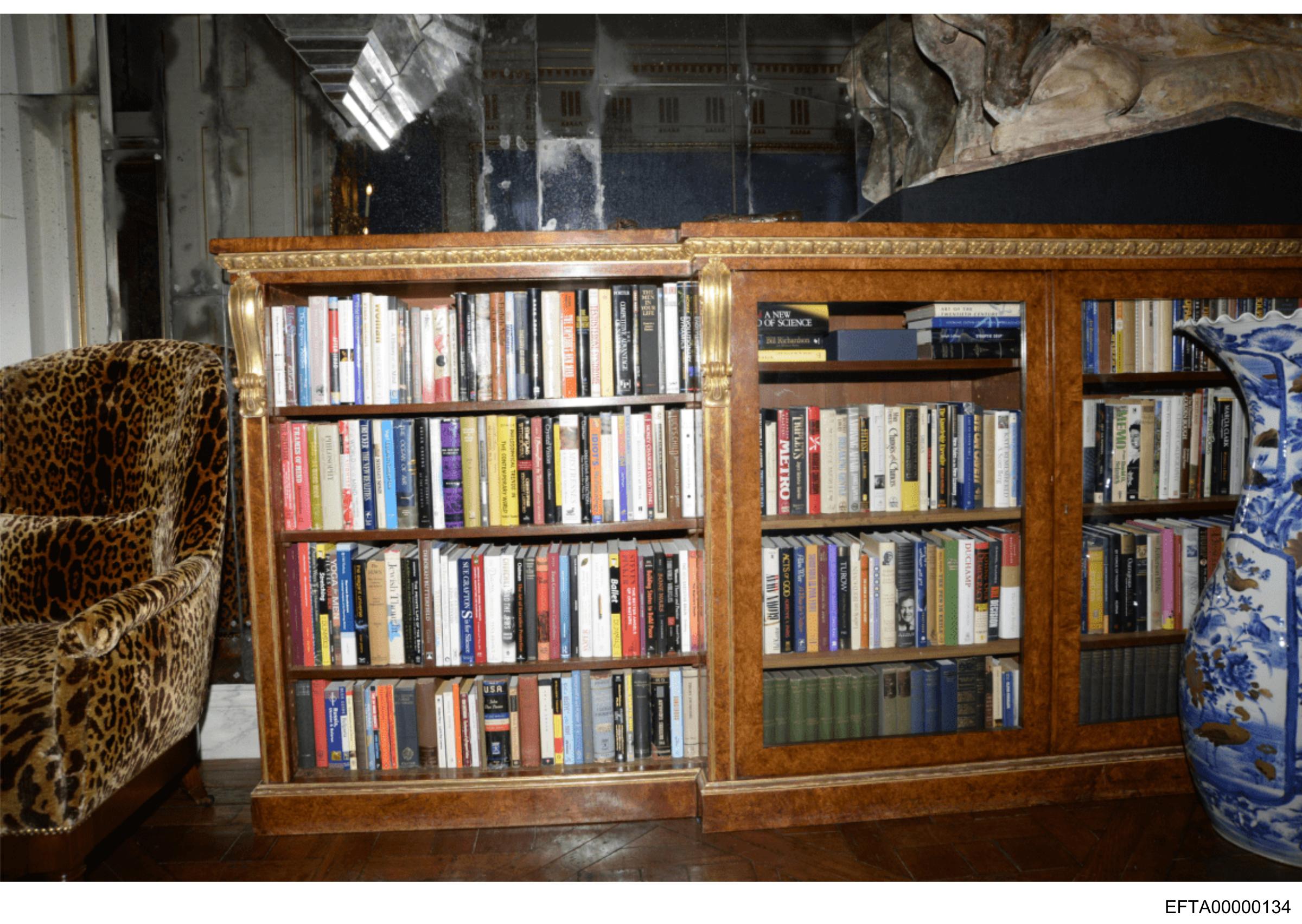 The image shows a large wooden bookshelf filled with numerous books of varying sizes and colors, indicative of a diverse collection.