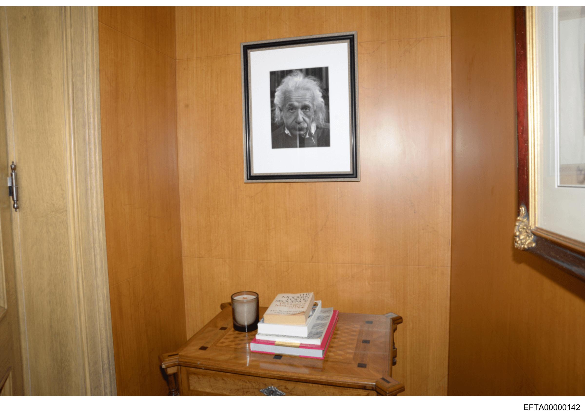 The image shows an interior wall paneled with a wooden finish, featuring an artwork that is a black and white photograph of Albert Einstein's face.
