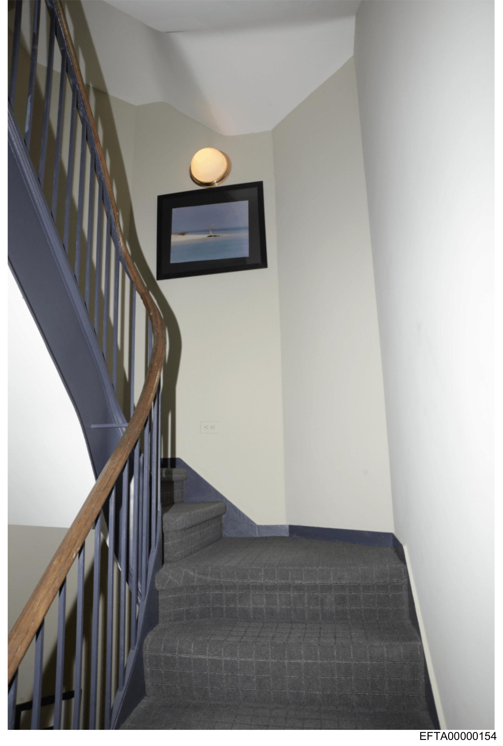 The image shows a staircase with light blue walls and a dark wooden handrail.