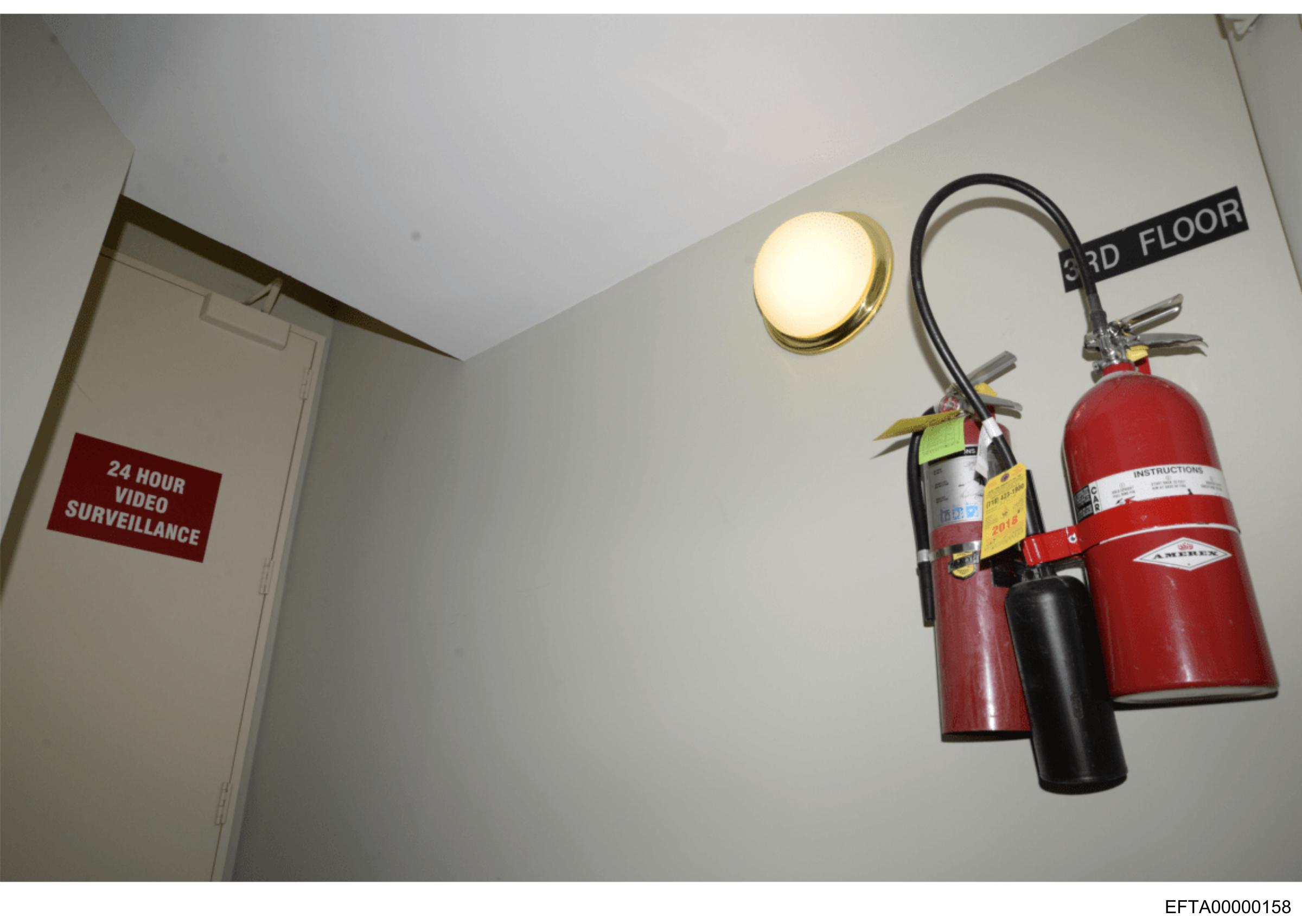 The image shows a hallway with two fire extinguishers mounted on the wall.