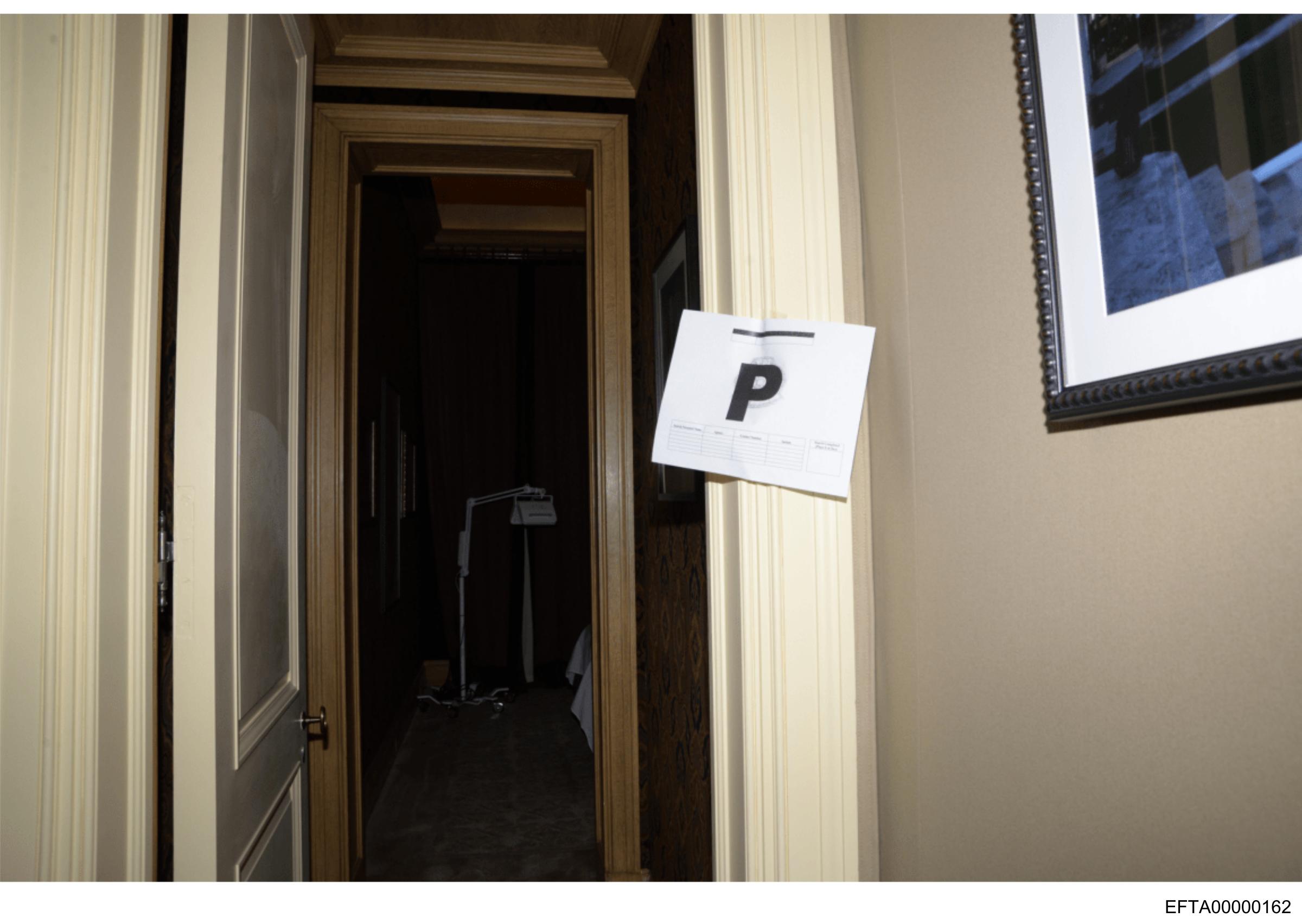 The image depicts an interior hallway with a wooden floor and walls. A sign bearing the letter "P" is prominently placed on a surface near the foreground, indicating some form of designation or direction. The photograph has an overlay effect that gives it a grainy, pixelated appearance, as if it were a digital reproduction of a physical print. There are no visible texts apart from the "P" sign. No people are present in the scene, and there's no text providing context or location information. The style of the image is realistic with an emphasis on texture due to the overlay effect.