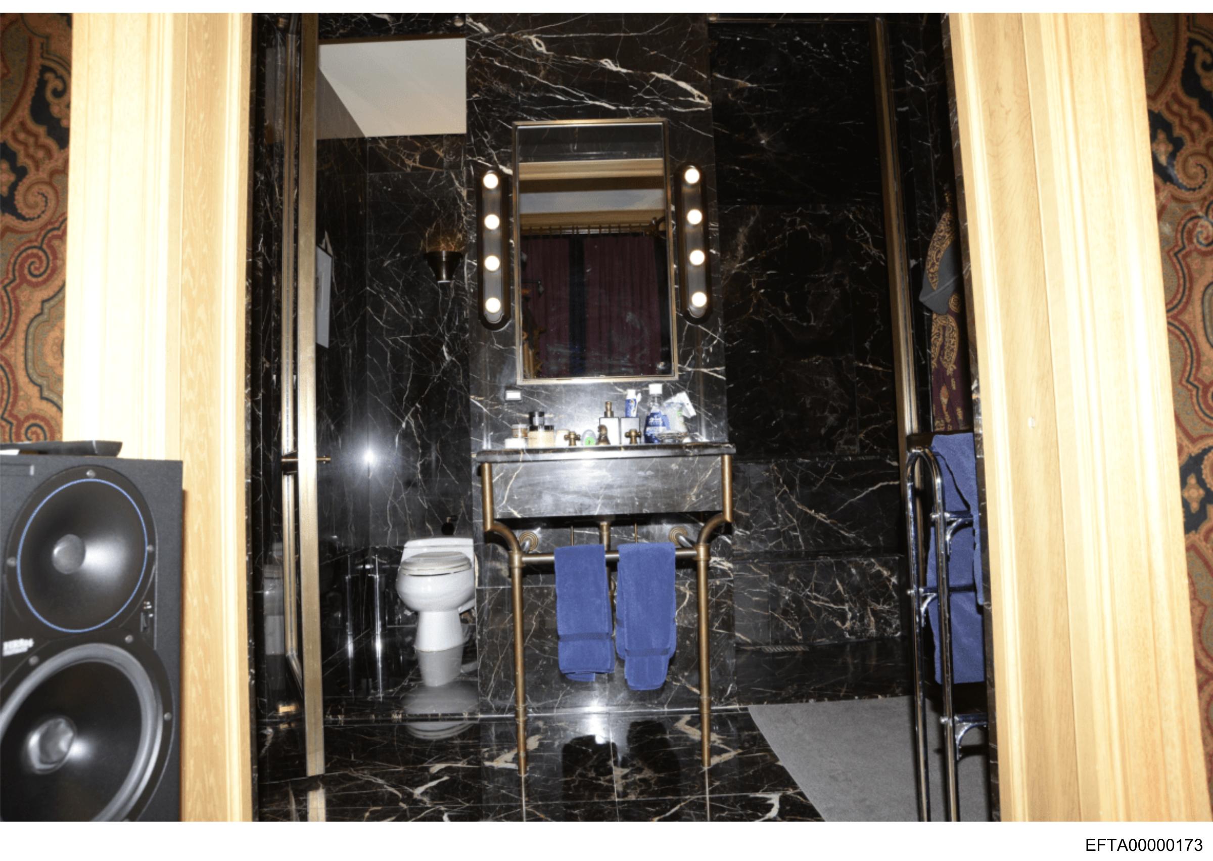 The image shows an interior space that appears to be a room within a building, possibly an apartment or hotel room given the presence of bathroom amenities and decorative elements typically found in such spaces. On the left side of the frame, there is a partial view of a person wearing headphones, which indicates that they might be listening to music or another audio source. The room features marbled flooring and walls, giving it an upscale appearance. There are several items on a counter: a roll of toilet paper beside a white porcelain toilet bowl, a black garbage bin, various bottles (possibly containing toiletries), and some towels. In the foreground, there is a small piece of furniture with drawers, likely a vanity or nightstand, which adds to the impression that this room serves multiple purposes for daily living or relaxation.