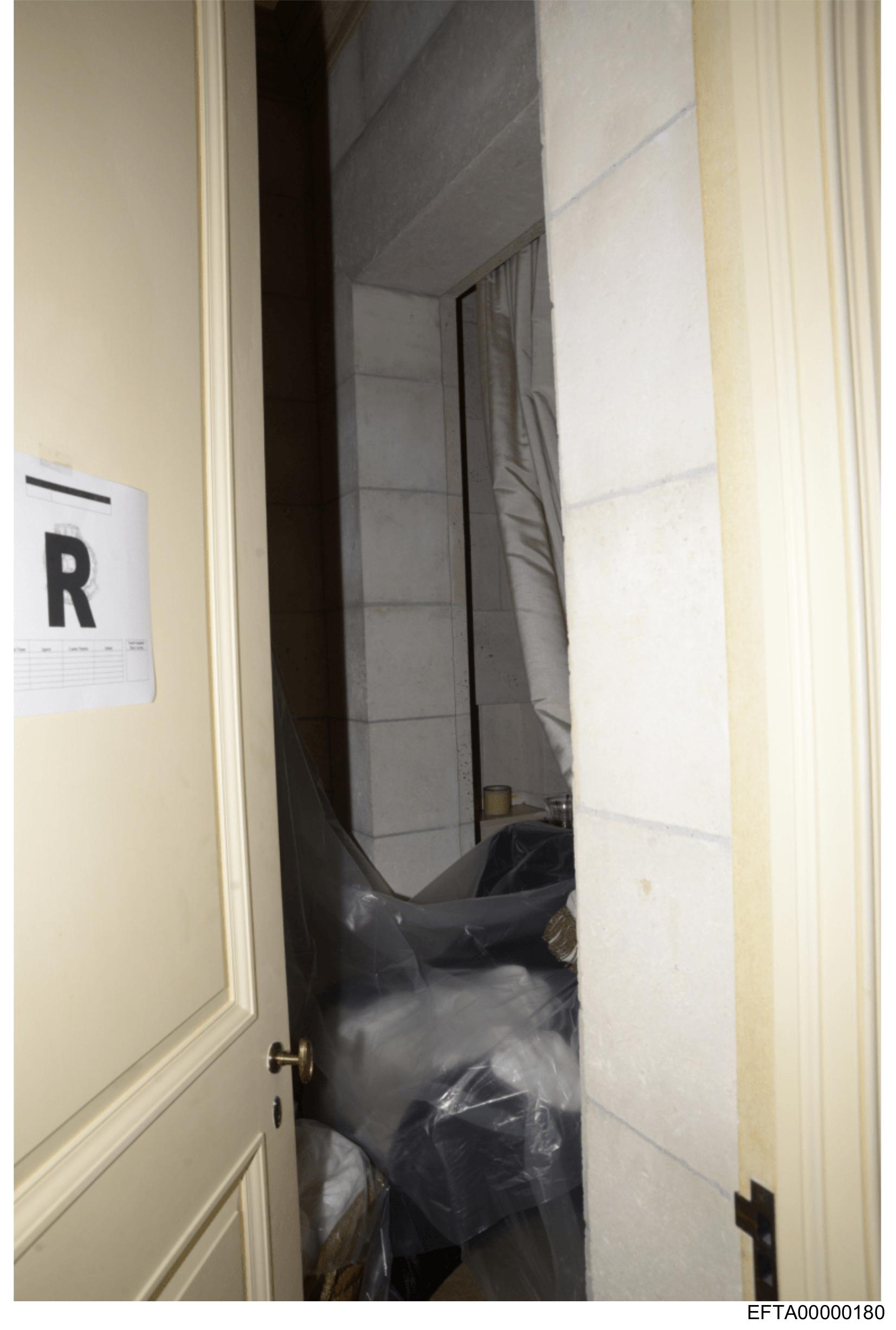 The image shows a doorway with the letter "R" printed on a sign to the left of the frame.