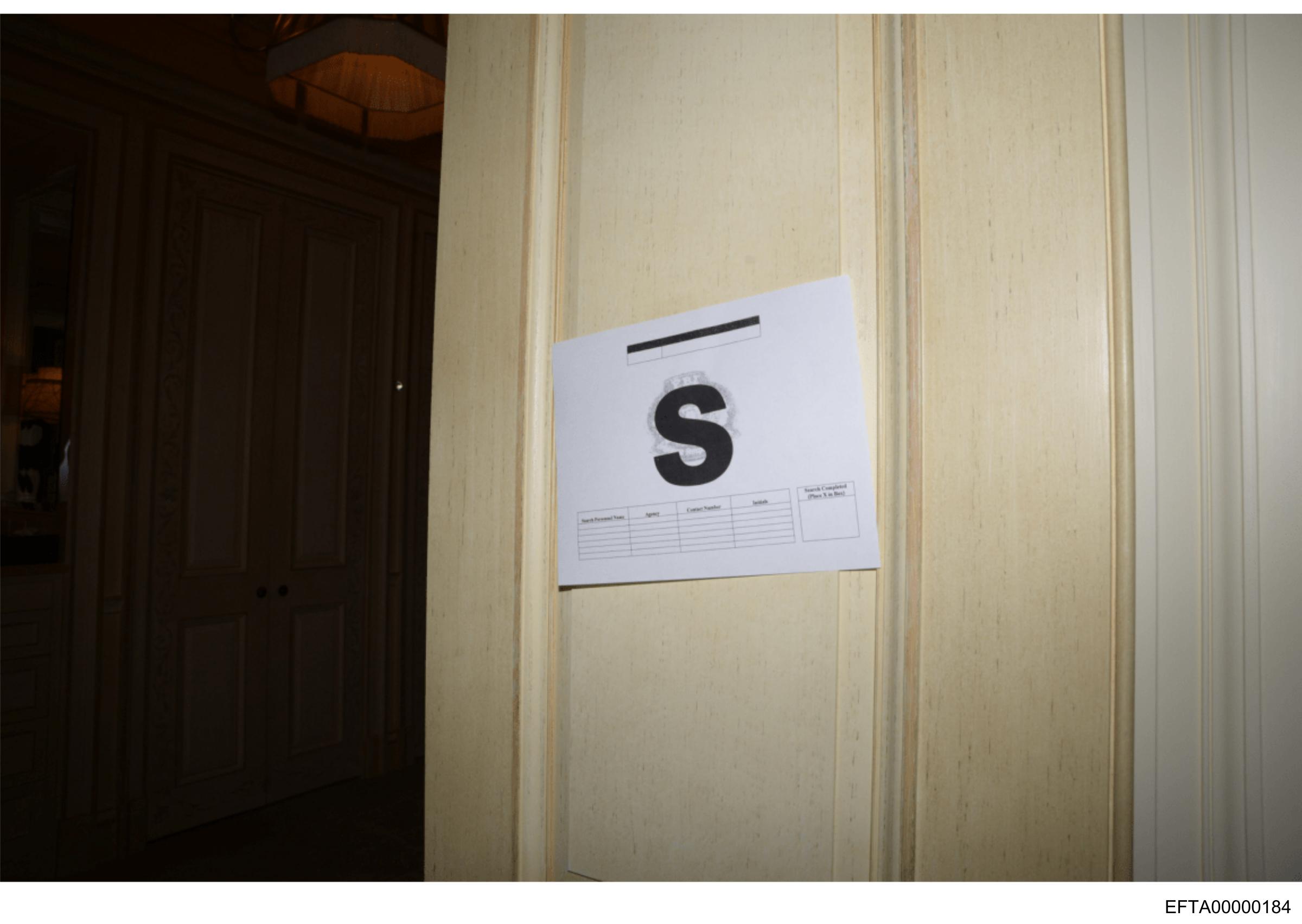 The image shows a room with an open door revealing another room inside. The walls of the room are painted and appear to be wooden. On the left side of the door frame, there's a sign that is partially obscured by the edge of the door. However, I can see part of the letter "S" in black font on a white background. The image has an overlay that looks like a digital glitch or error, with distorted lines and colors across the entire photo, which suggests it might have been taken through a screen displaying another image or there was an issue with the camera's focus or lens.