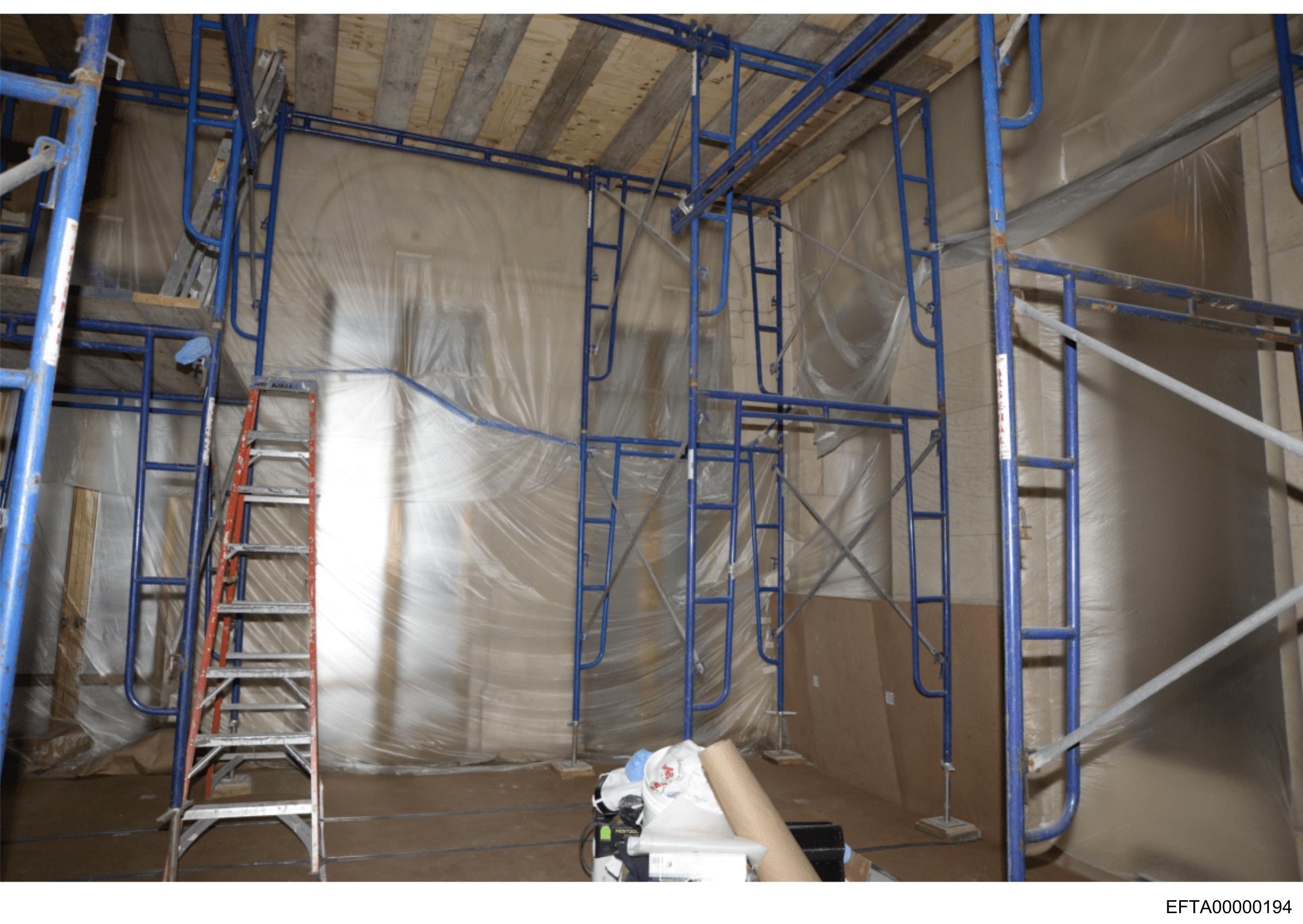 The image shows an indoor construction site with scaffolding set up around a room that appears to be under renovation.