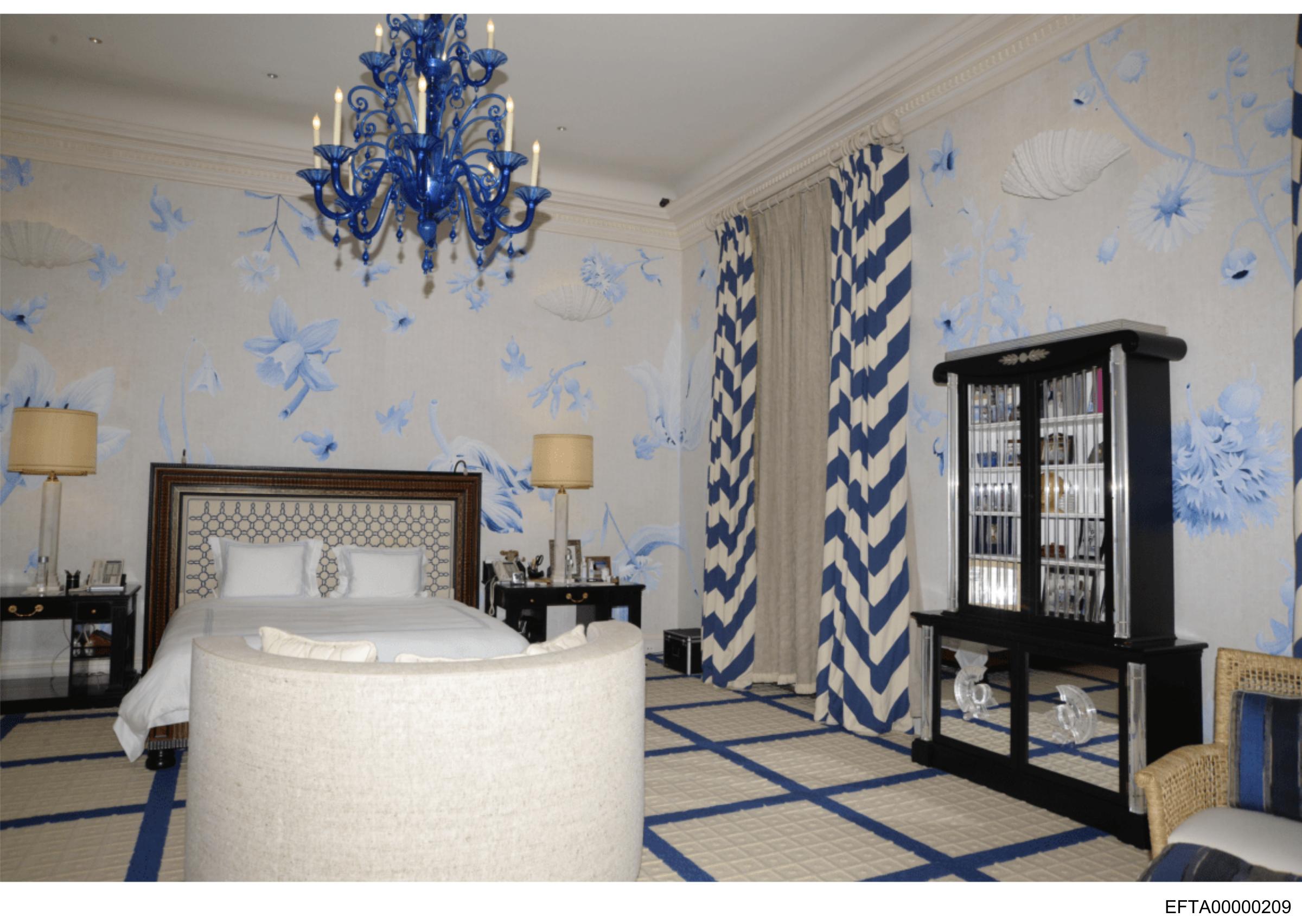 The image captures a luxurious bedroom with an opulent design. Dominating the room is a large king-size bed dressed in pristine white bedding and accented by blue throw pillows. The walls are adorned with intricate blue and white floral wallpaper, adding a touch of elegance to the space. On either side of the bed stand tall chests of drawers, each fitted with a mirror reflecting the room's grandeur. A large chandelier with intricate blue accents hangs from the ceiling, casting an array of light throughout the room. The flooring is carpeted in blue and white patterns that echo the design on the walls, creating a harmonious color scheme across all surfaces. The room exudes luxury and comfort, each element carefully chosen to create a cohesive and aesthetically pleasing environment.