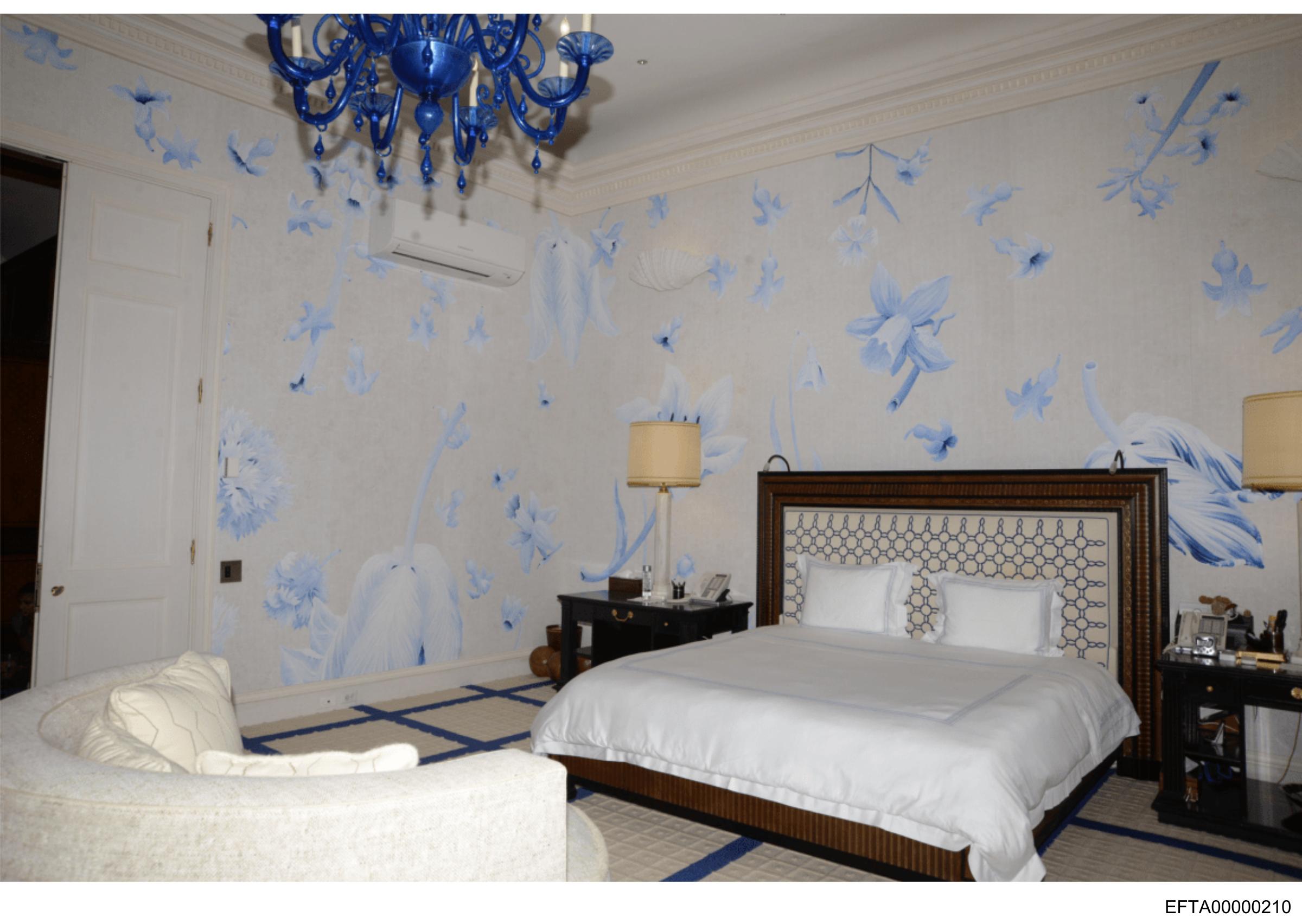 The image shows an interior room with blue floral wallpaper on the walls. There is a four-poster bed with white bedding and a wooden headboard. In front of the bed, there's a small table with what appears to be a lamp. Above the bed hangs a chandelier, adding a touch of elegance to the space. The room also contains an armchair with a cushion in the corner, suggesting it might be used for relaxation or reading. There are no visible texts or people in the image. The overall decor gives the room a classic and cozy atmosphere.