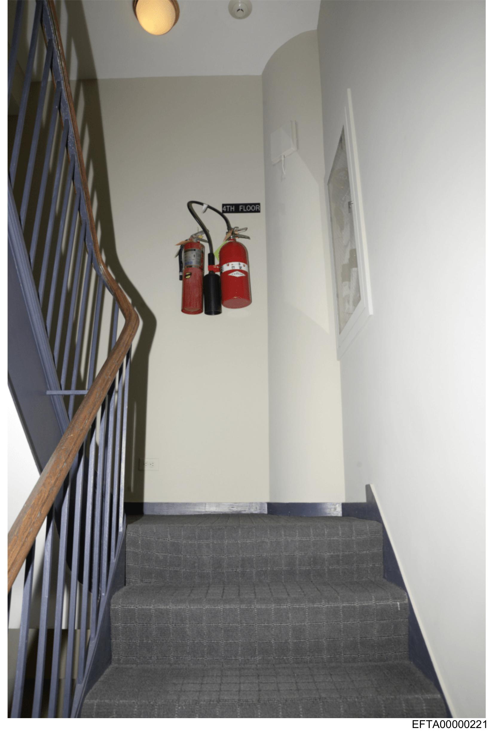 The image captures a quiet scene at the foot of a staircase. The stairs are unoccupied and appear to be ascending to an unseen upper level. On the wall next to the stairs, a fire extinguisher is mounted, ready for use in case of emergencies. Above this fire safety equipment, a sign with the words "YOUR GATE" is visible, possibly indicating the entrance or exit point from this area. The overall atmosphere suggests a calm and orderly space.