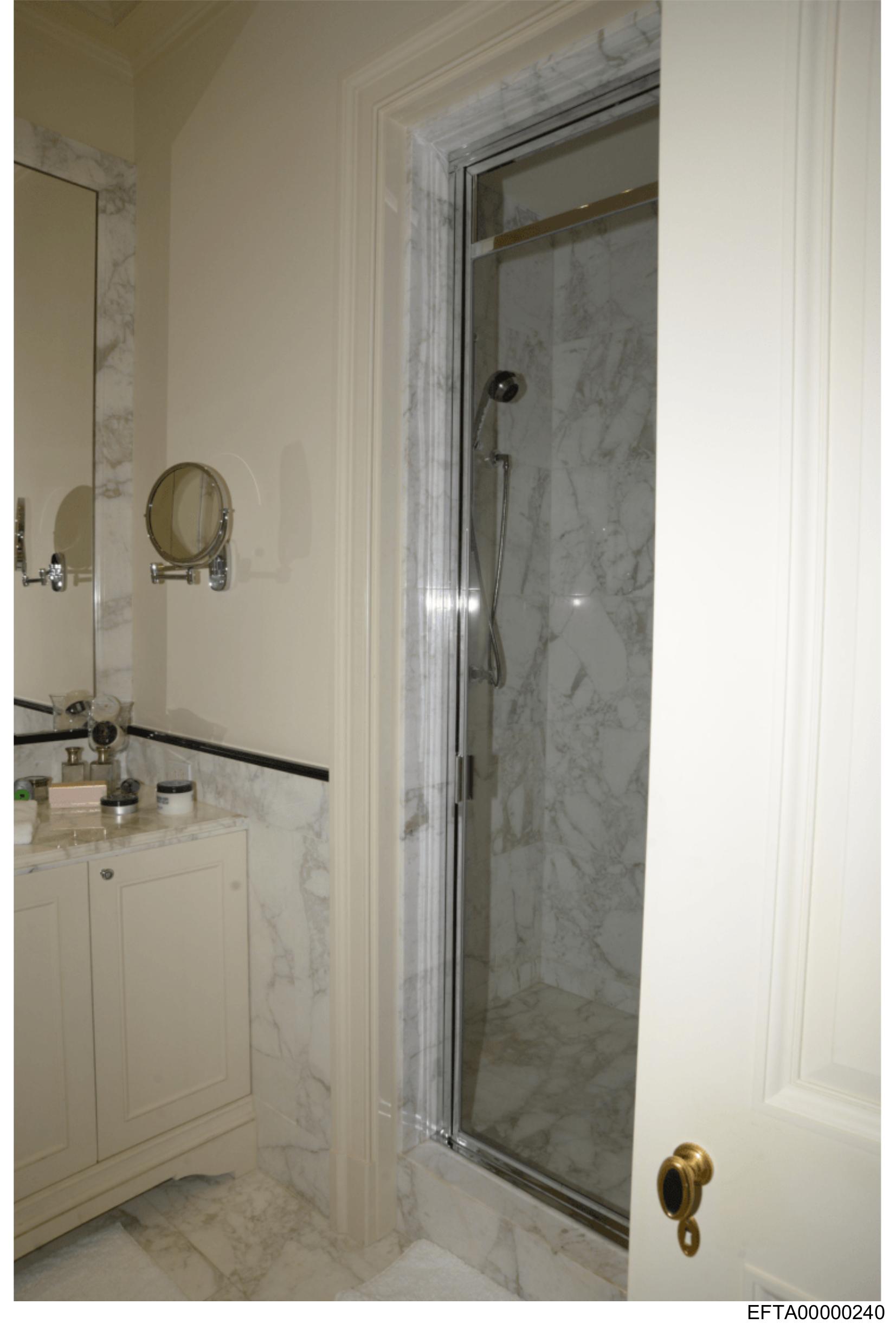 The image depicts a bathroom interior. The room features marble countertops and walls, with a large white vanity under the sink area. A clear glass shower enclosure is partially open on the right side of the frame, revealing that it has been recently used as indicated by the visible steam or condensation. Above the vanity mirror hangs a small wall-mounted lamp. There are no texts or identifiable brands in the image. The lighting suggests either early morning or late evening due to its soft and diffused nature.