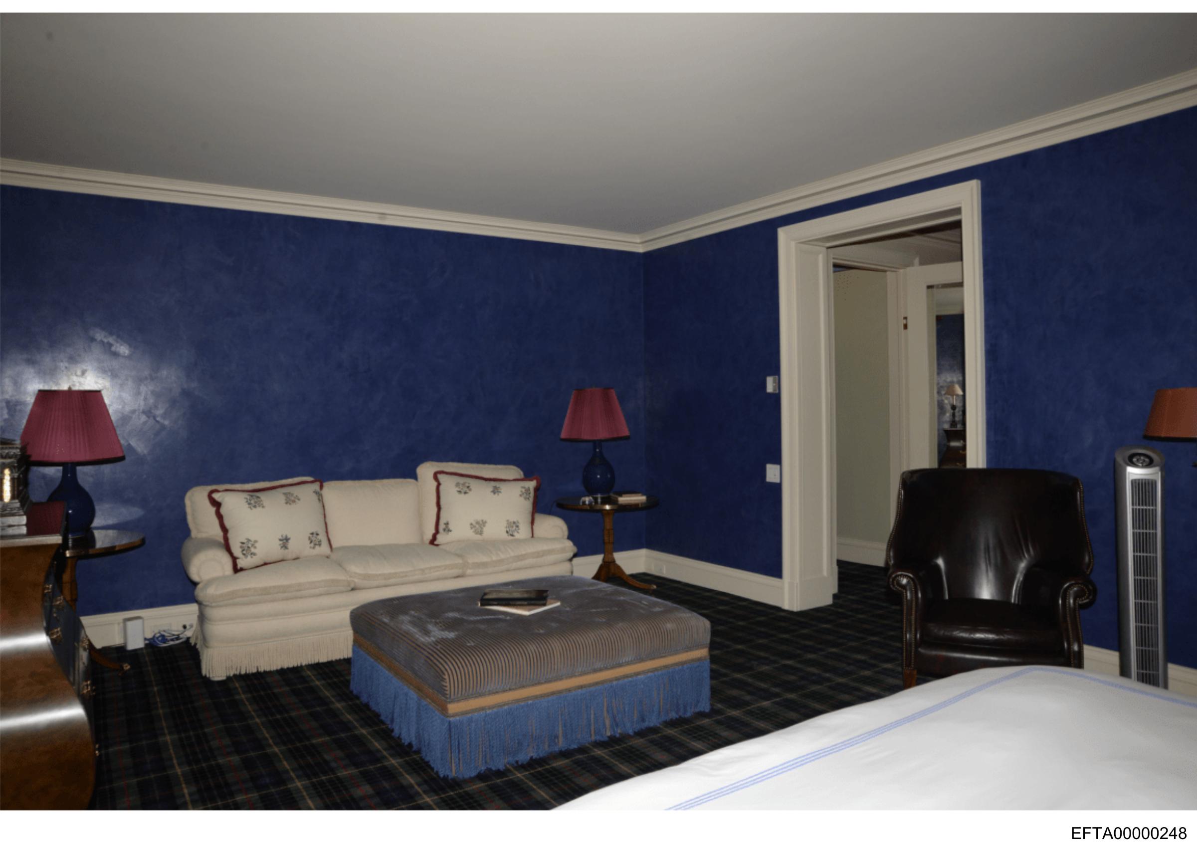 The image shows a well-appointed bedroom with a blue wall and a white ceiling.