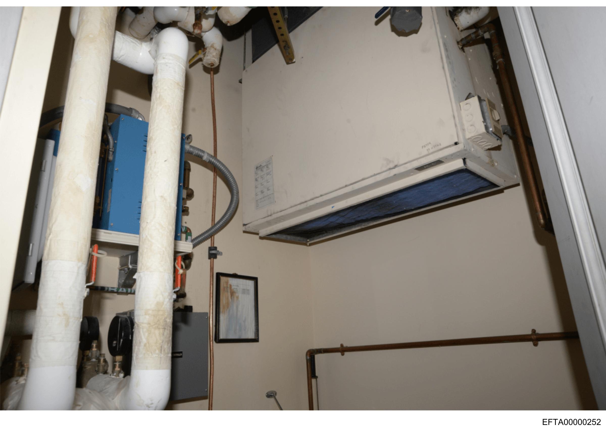 The image shows the interior of a room with various mechanical and electrical components. There is an air conditioning unit on one wall, with its ductwork extending to other parts of the ceiling. The floor has some sort of machinery or equipment that appears to be related to HVAC systems, judging by the presence of pipes and fittings. On the right side, there's a door slightly open, allowing a view into another room beyond. In the foreground, there is a piece of equipment with a red handle, which could be part of an emergency system or maintenance tool. The image has a watermark at the bottom with the text "etuxox", possibly indicating ownership or source of the photo.