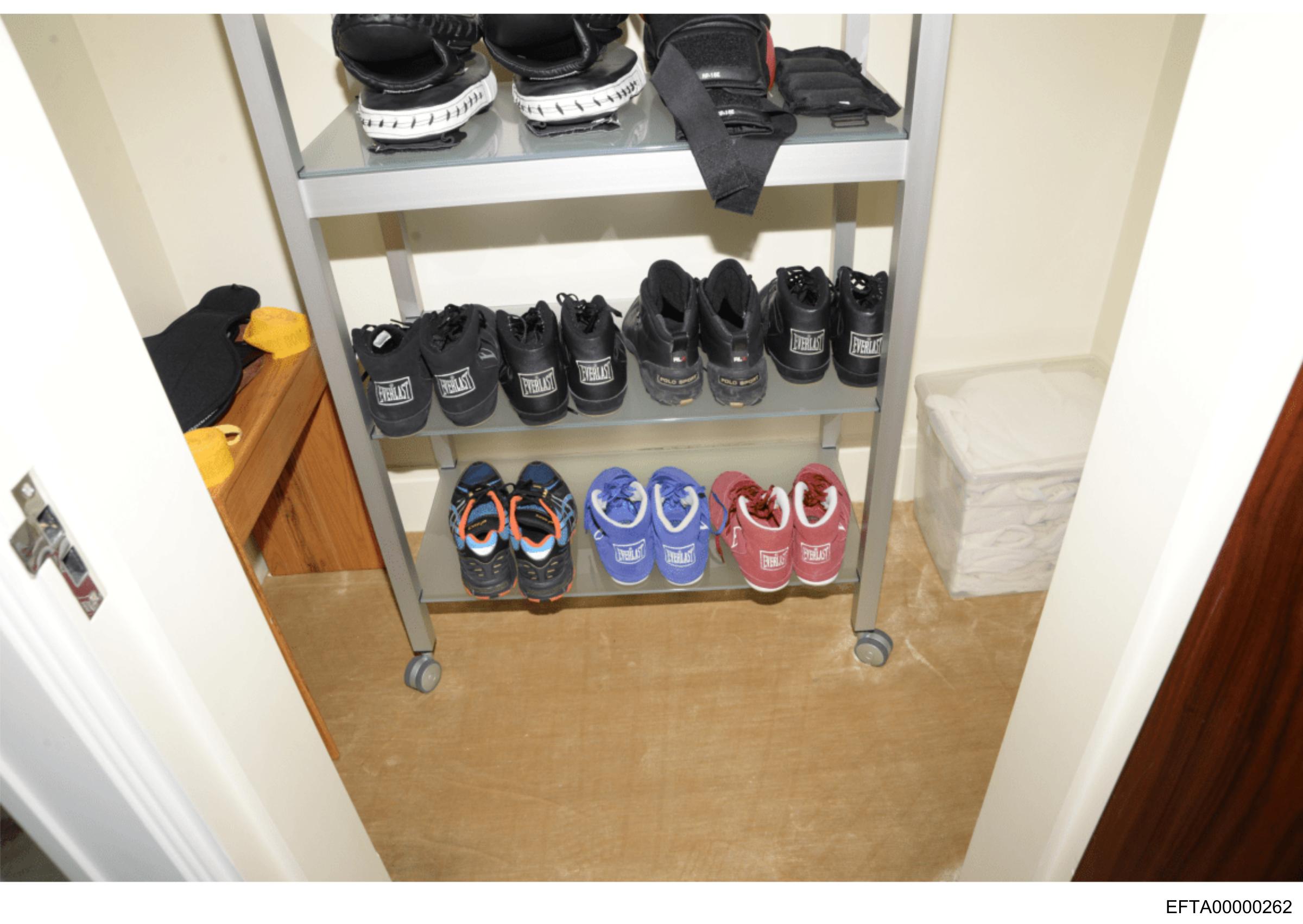 The image shows a metal shelving unit with three shelves placed inside what appears to be a storage room or closet. On the shelves are various pairs of shoes and sports equipment. The shoes display a range of colors and styles, indicating they may belong to multiple individuals. There is visible text on one shoe that reads "NIKE" in white letters, signifying it is a branded item from the Nike company. The image is slightly blurry, suggesting it might have been taken hastily or with low lighting conditions.