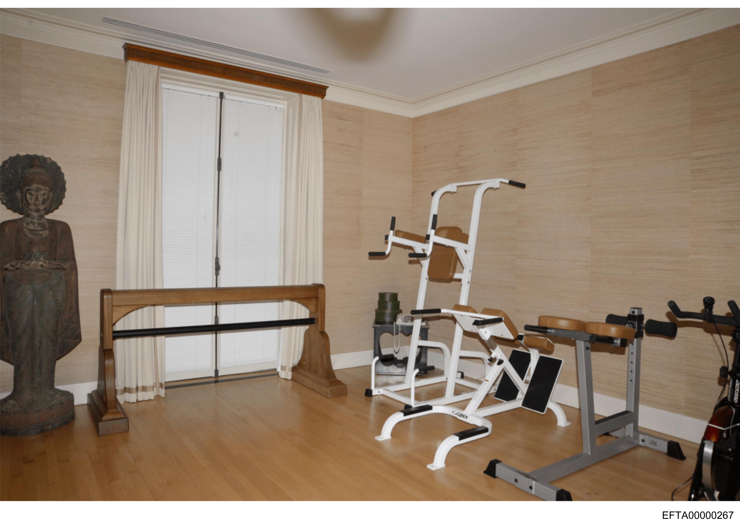 The image shows an indoor setting with various pieces of exercise equipment placed on a wooden floor.