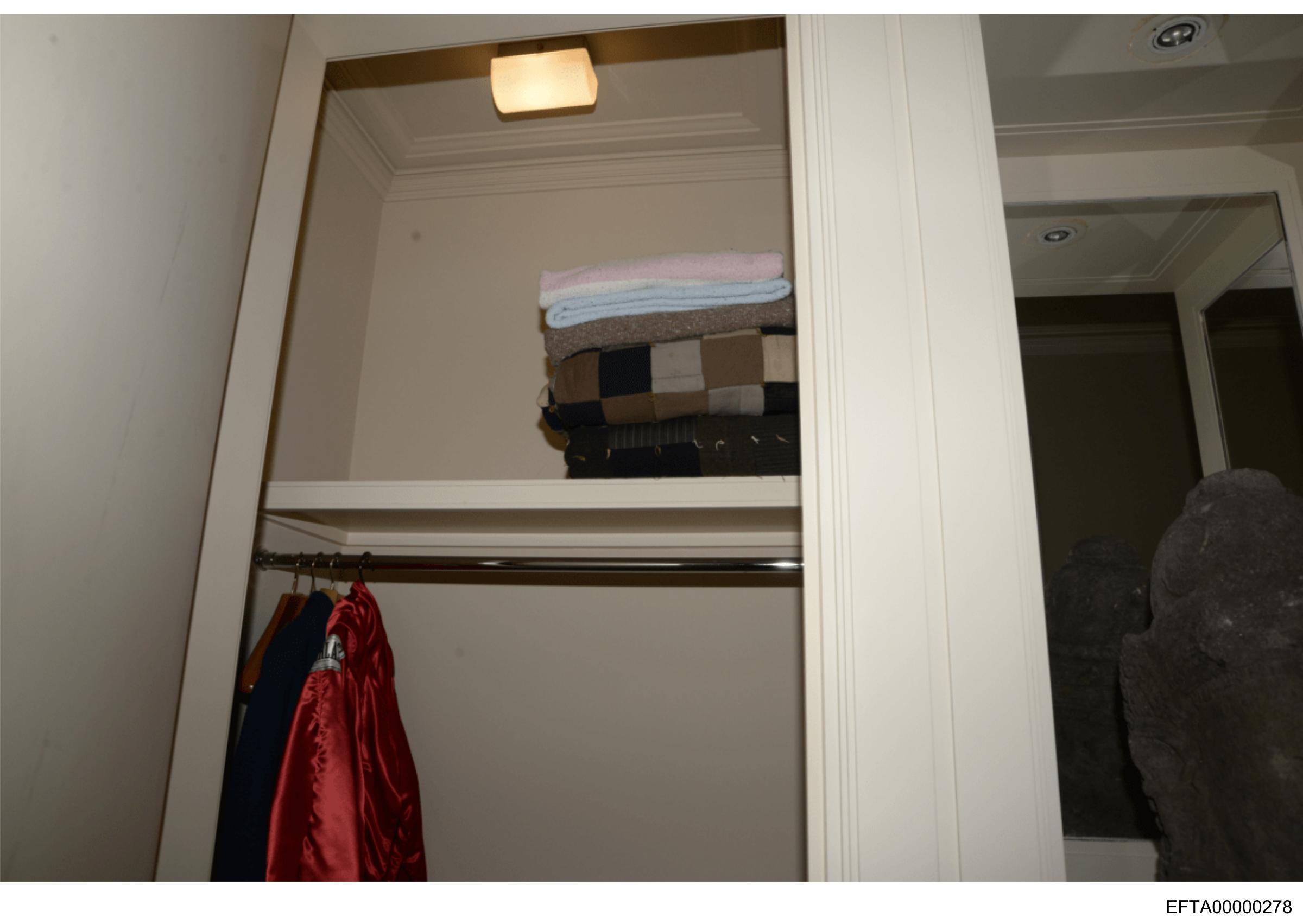 The image depicts an interior scene of a room with a partial view of its furnishings and decor. The photo appears to have been taken from behind the closed door, which is slightly open, offering a glimpse into the room. Inside, there's a small closet space with shelves holding folded items that could be clothing or linens. Adjacent to this closet, part of another piece of furniture can be seen, possibly a bed due to the presence of what seems to be bedding materials like pillows or blankets. The walls are painted in a light color, and there's no visible text or people in the image. The style of the photograph is candid and appears to have been taken without any professional staging, as evidenced by the door frame partially cutting off the view and the casual arrangement of objects within the room.