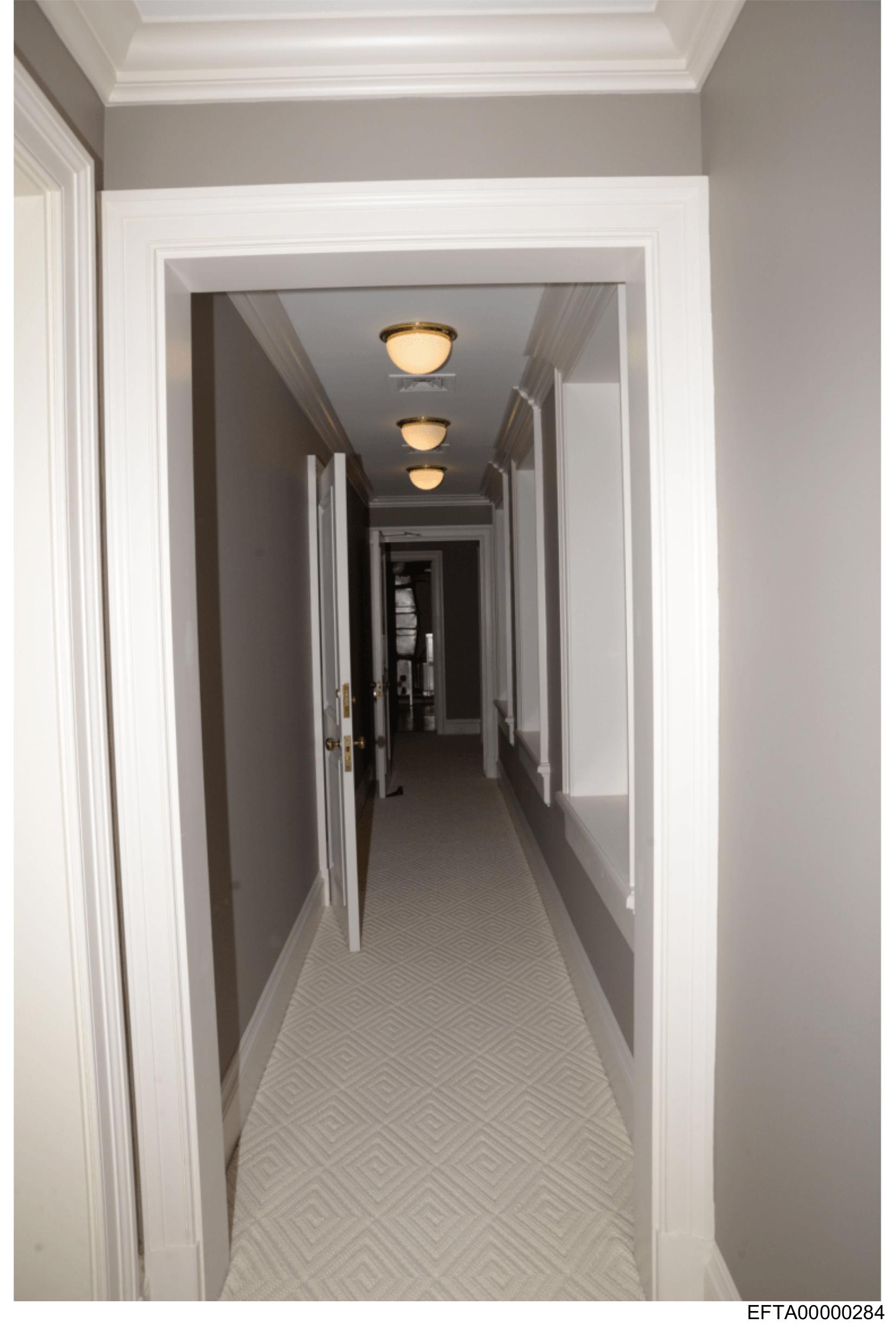 The image presents a long hallway with carpeting that extends towards the end, where there is an obscured view due to a darkened lens flare effect.