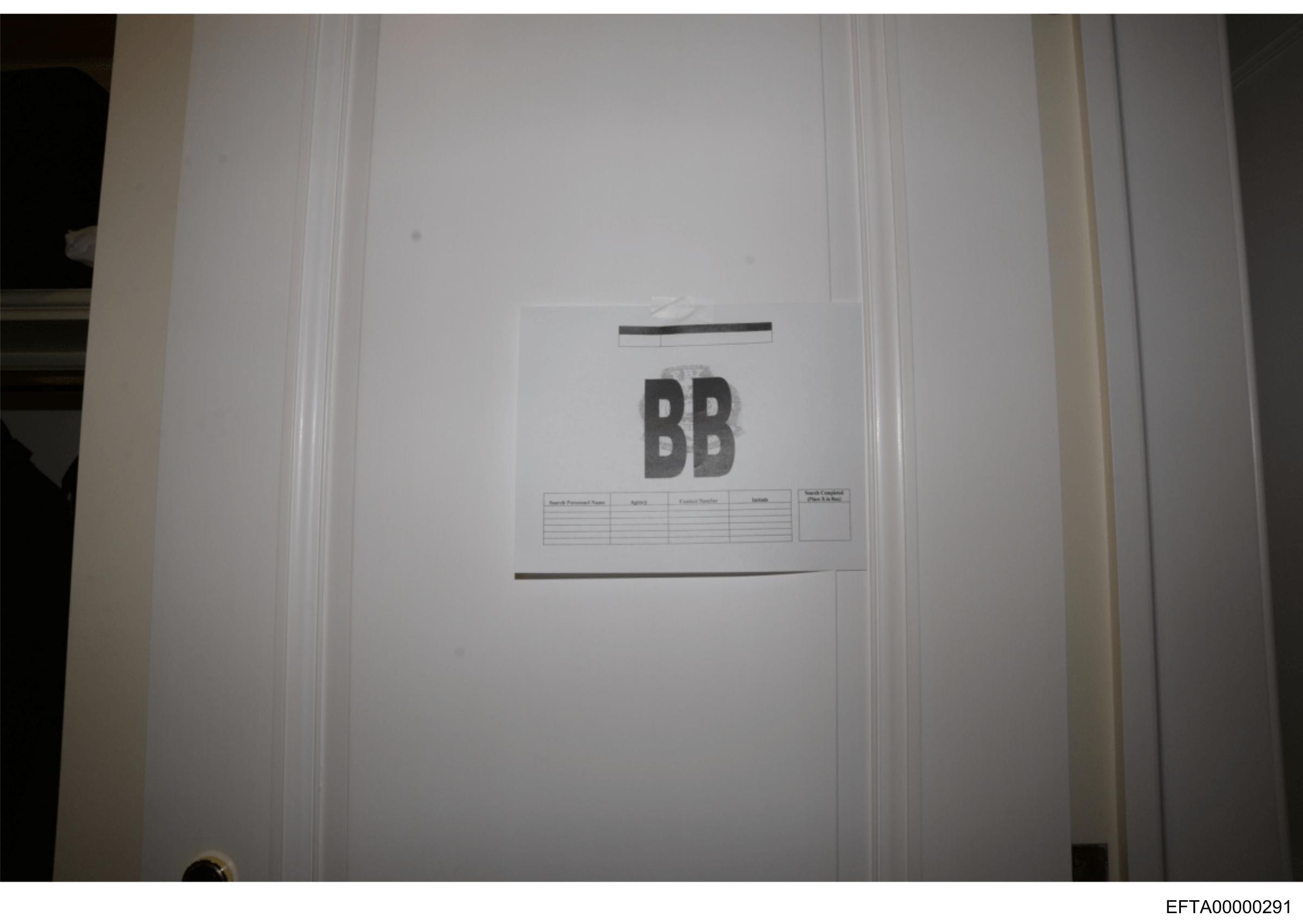 The image displays a white door with a printed sign attached to it. The sign contains text and appears to be rectangular with borders on all sides, giving the impression of being securely placed on the door. However, due to the distortion affecting the image, the full content of the text is not clearly readable, but I can discern some uppercase letters in bold black font against a lighter background within the sign. The room's interior beyond the door is visible but out of focus.