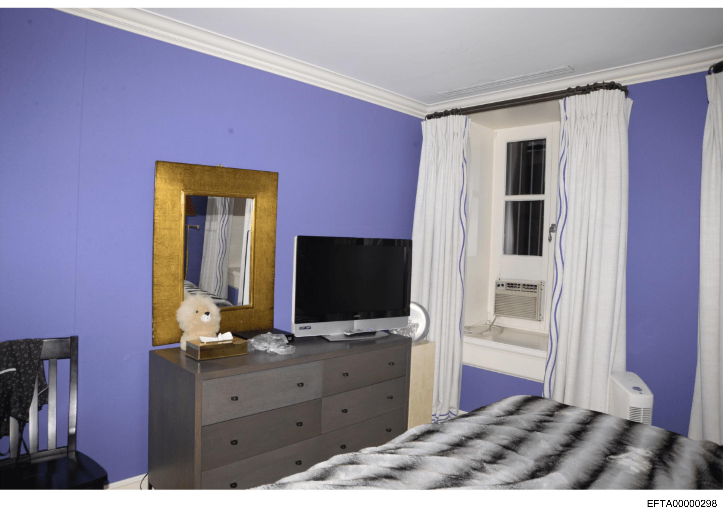 The image shows an interior room with a distinct color scheme. On the left side of the frame, there is a blue wall above which a gold-framed mirror hangs on the wall. Below the mirror, on what appears to be a chest or dresser, rests a small, fluffy white object that could be a pet or a toy. To the right, occupying most of the space, is a bed with a patterned duvet cover in shades of blue and white. Above the bed, there are white curtains partially drawn back from a window, revealing an air conditioning unit inside. The room has a cozy and lived-in feel.