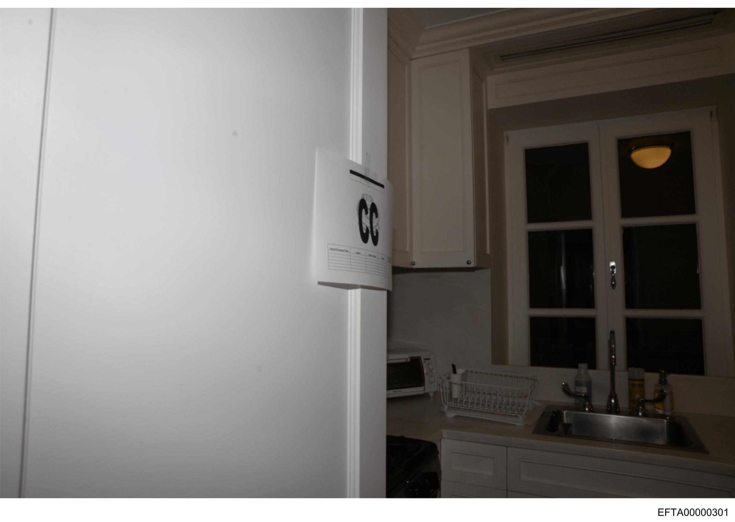 The image captures a scene in what appears to be a kitchen with an open doorway leading to another room. The dominant colors are neutral tones of white and gray. To the right, there's a sink under a window, which is covered by blinds or curtains. A metal faucet over the sink is visible. On the left, a sign with the letter "C" is affixed to a wall, possibly indicating an area or room name in a facility such as an apartment complex. The floor has dark tiles. There's no text that provides additional context, and there are no people present in the image.