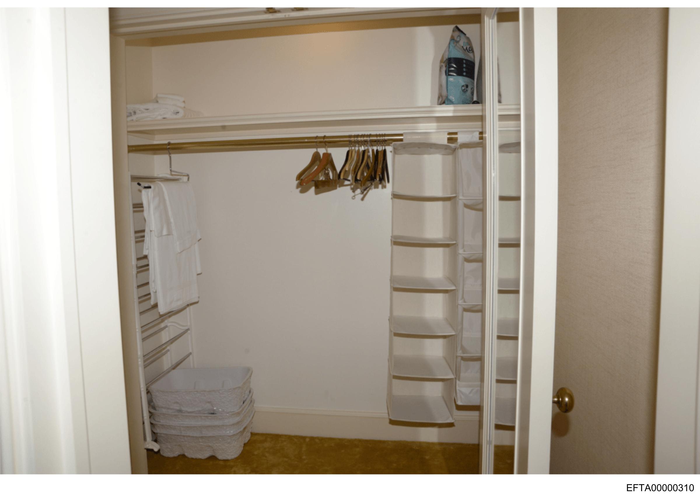 The image appears to be a low-resolution photo of an interior space that resembles a storage closet or pantry. In the room, there are several white shelves against one wall, which seem to be empty. A stack of folded towels is visible at the bottom shelf. On the other side of the room, hanging on what looks like hooks or a rack, there are various items that might include linens or clothing. The lighting in the room is bright and even, suggesting artificial light sources rather than natural daylight. There's some text overlaid on the image that reads "ETOX," but without context it's unclear what this refers to. The quality of the photograph is grainy with pixelation visible around the edges and throughout the image, which suggests it might have been taken with a low-quality camera or has been reduced significantly in size. The door at the end of the room indicates an exit or entrance, but there are no visible people or locations that would provide further context about where this space is situated.