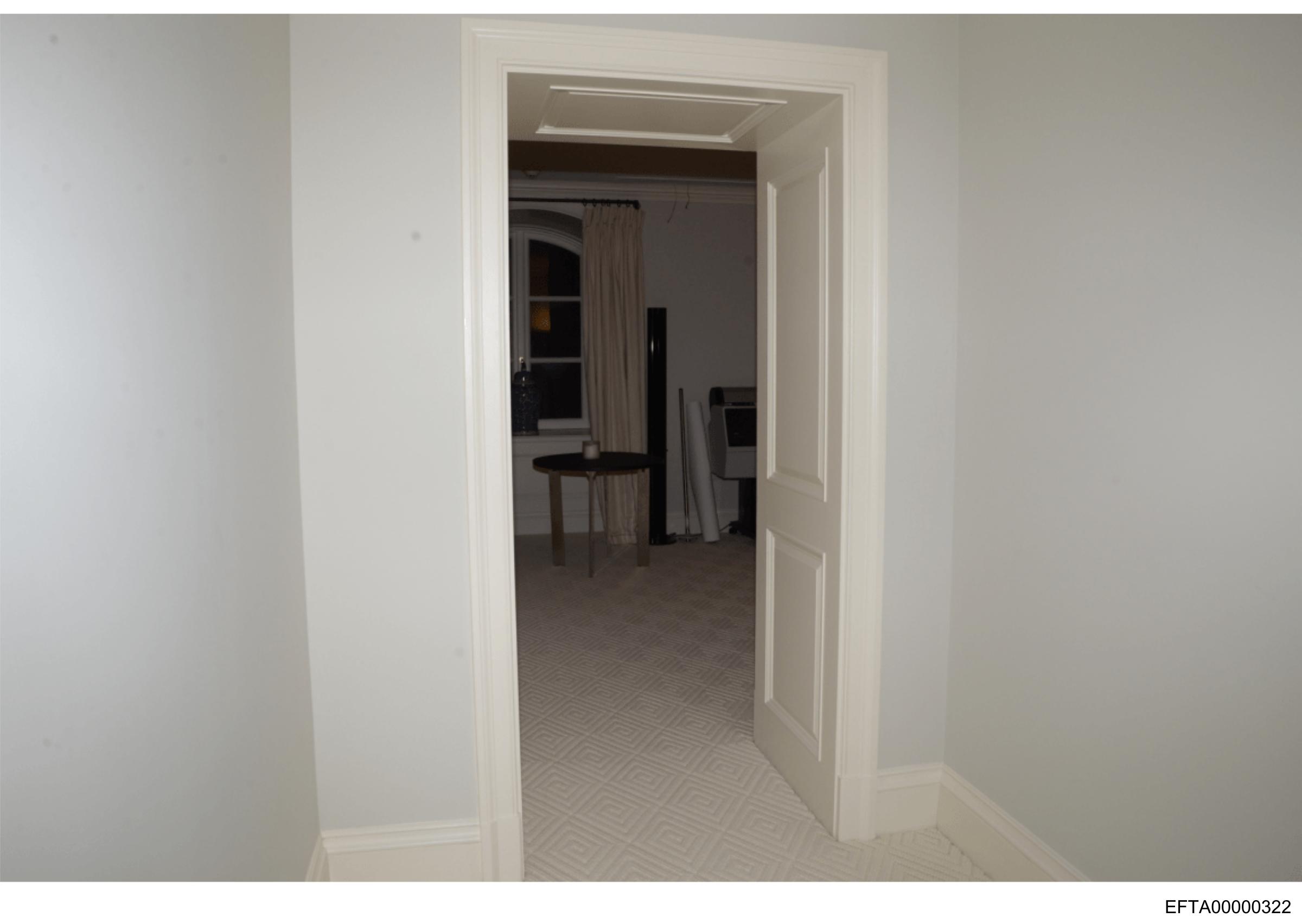 The image shows an interior space viewed from a doorway. The door is partially open and there's a dark hallway leading into the room. On the wall, there are three black rectangles that appear to be missing sections of the picture frame where you would typically see windows or glass panes in a normal photo. The floor visible inside the room has a light-colored carpet with small patterns. There is no text present in the image. The style of the image suggests it could be digitally altered, possibly for artistic effect, as indicated by the missing sections of the picture frames.