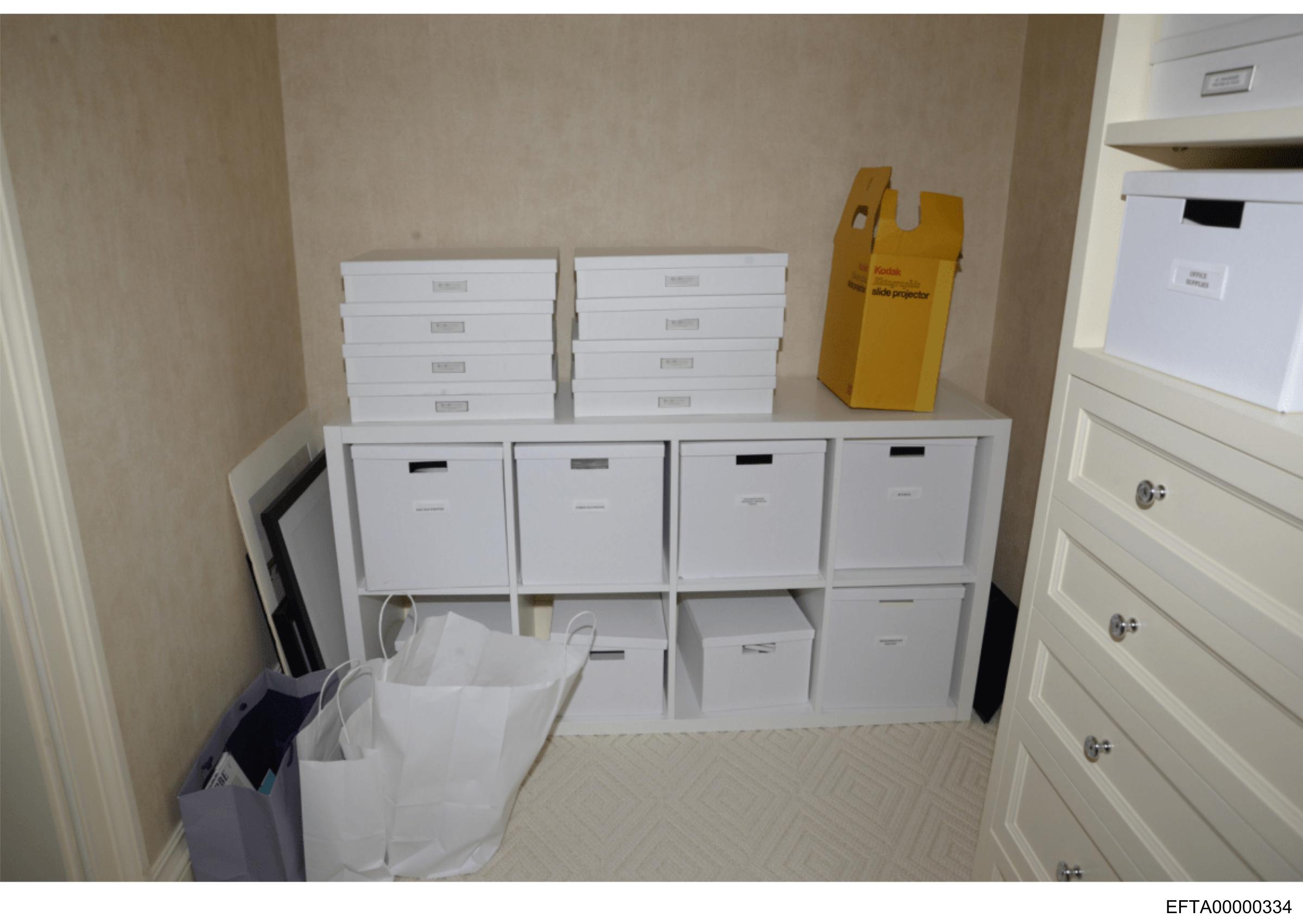 The image shows an office space with a storage area that appears to be in the process of being organized or tidied up.