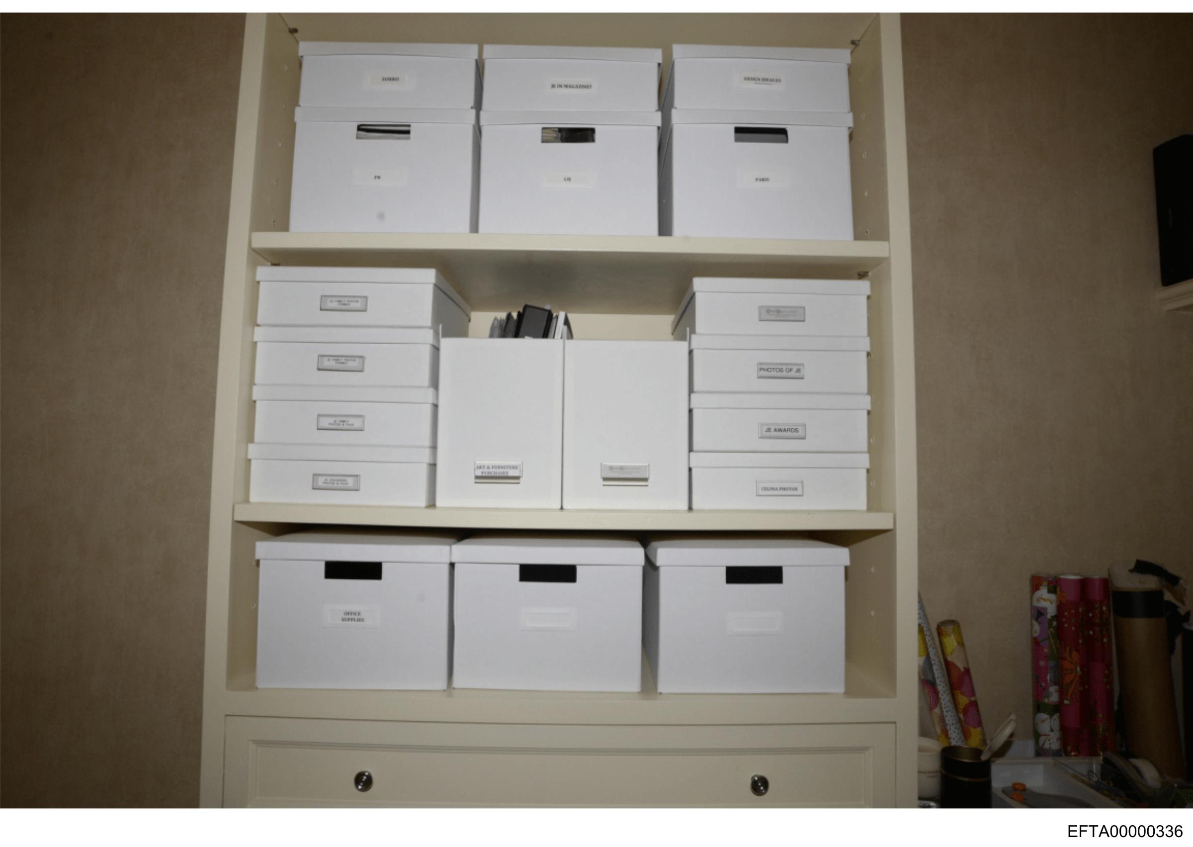 The image shows a shelf with multiple white boxes neatly stacked on top of each other.