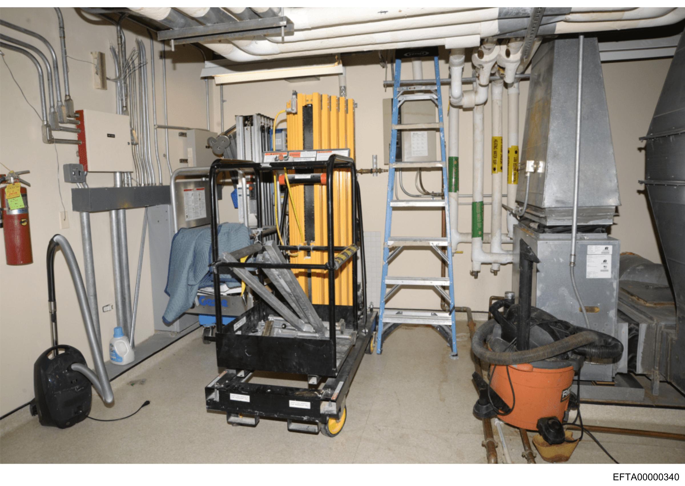 This is an interior photo of a workshop or factory space with industrial equipment and tools. There's a yellow forklift in the center, which appears to be parked or possibly undergoing maintenance or repair. To its left, there are metal scaffolding towers stacked together against a wall. On the right side, there's what looks like an industrial oven or furnace. The floor is made of concrete, and there's a black bag placed near the center of the image. In the bottom right corner, there's a watermark with text that reads "EXPO 2015". The overall ambiance suggests this might be part of a trade show or exhibition related to industrial machinery.