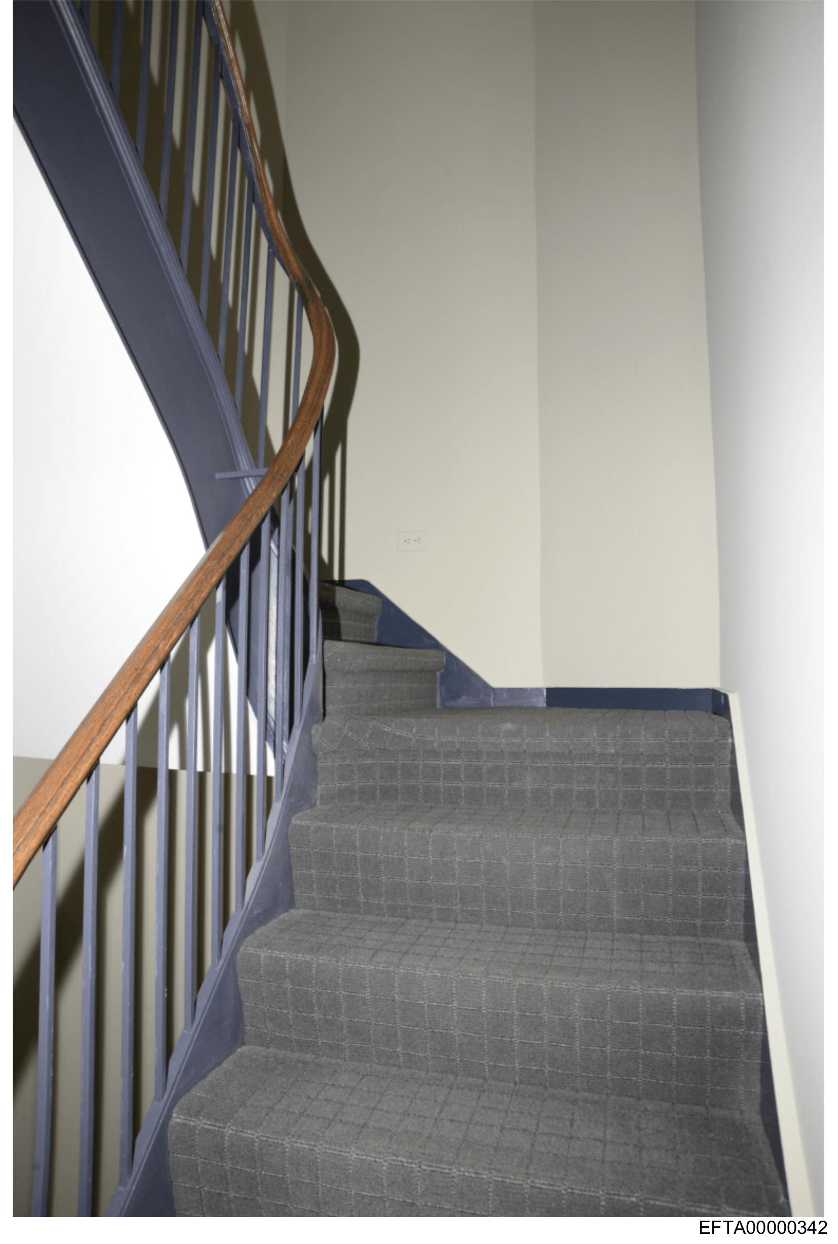 The image shows a staircase with wooden banisters and carpeted steps.