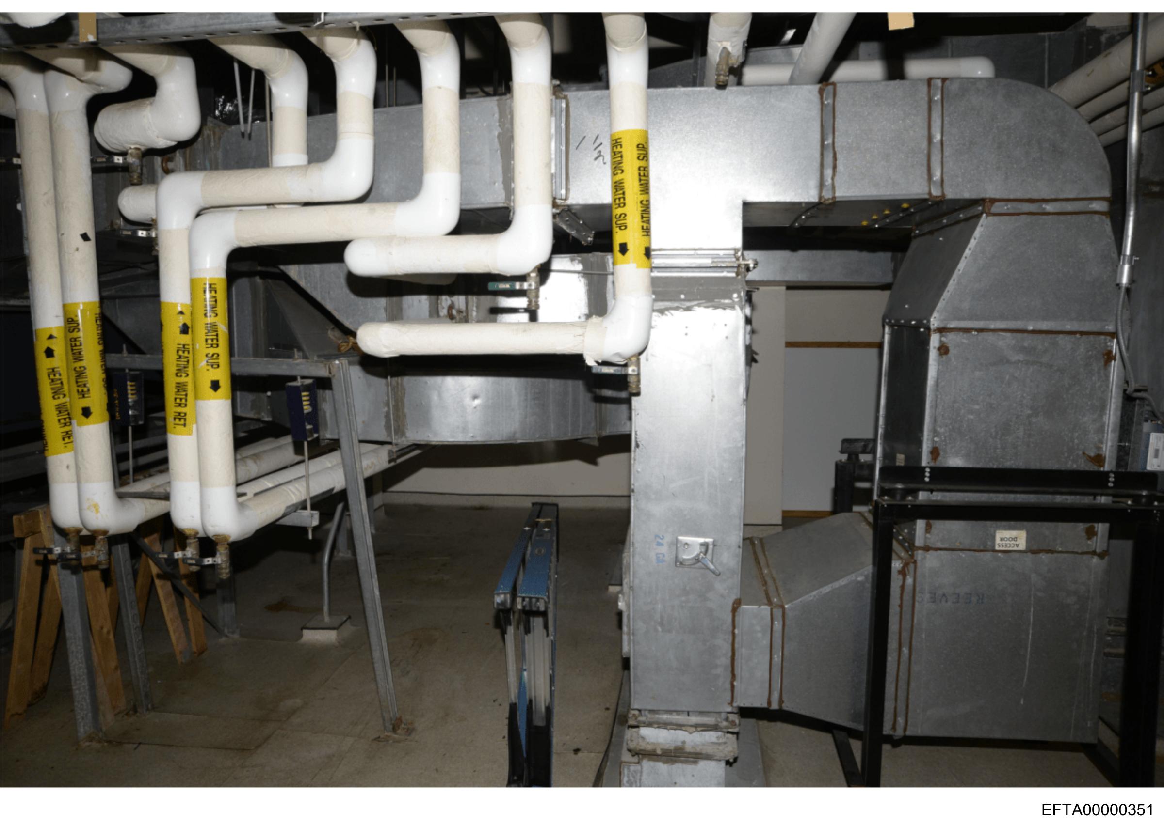 The image shows an indoor setting with a complex arrangement of piping and ductwork.