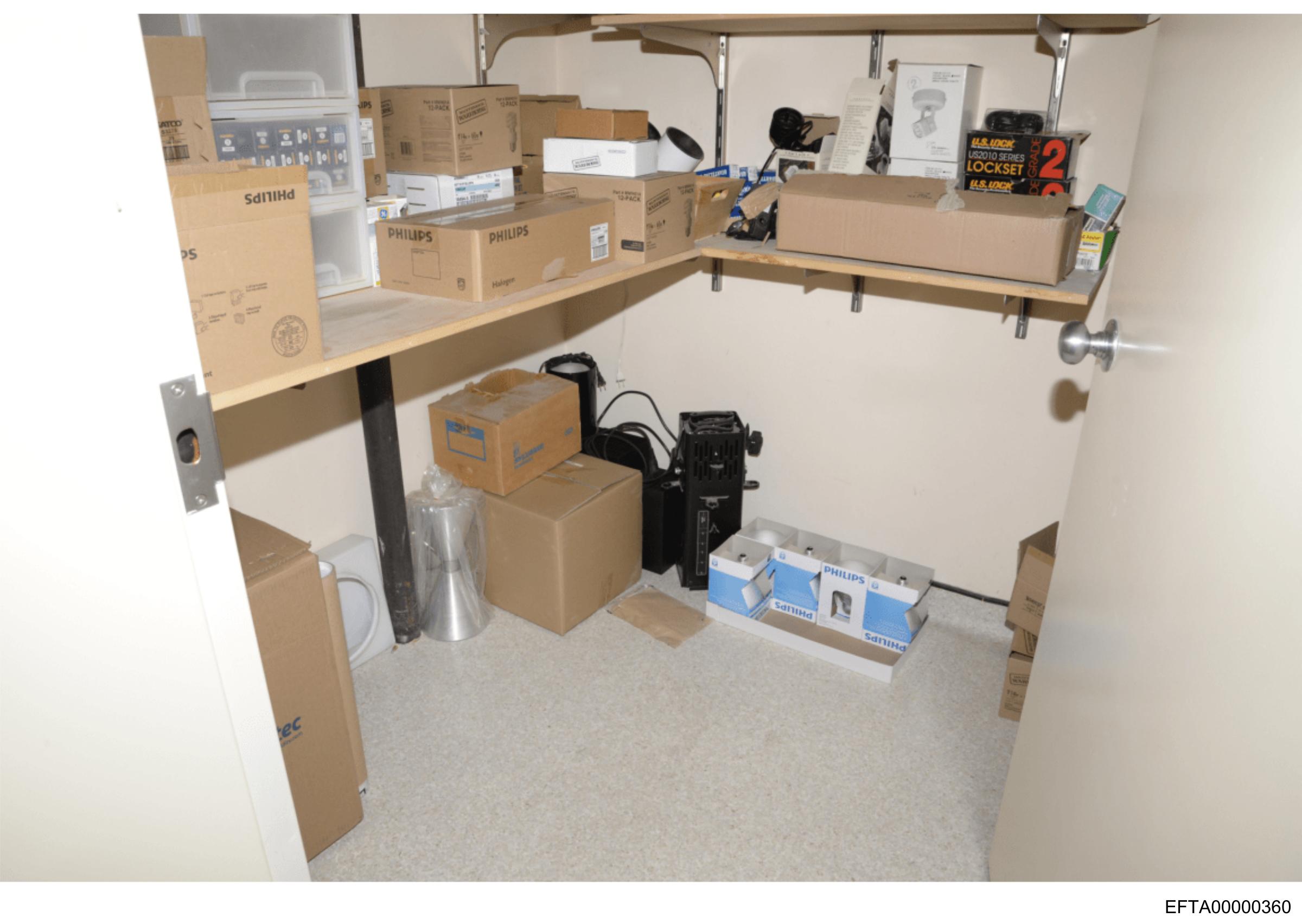 The image shows a cluttered storage room with various items stored on shelves and the floor.