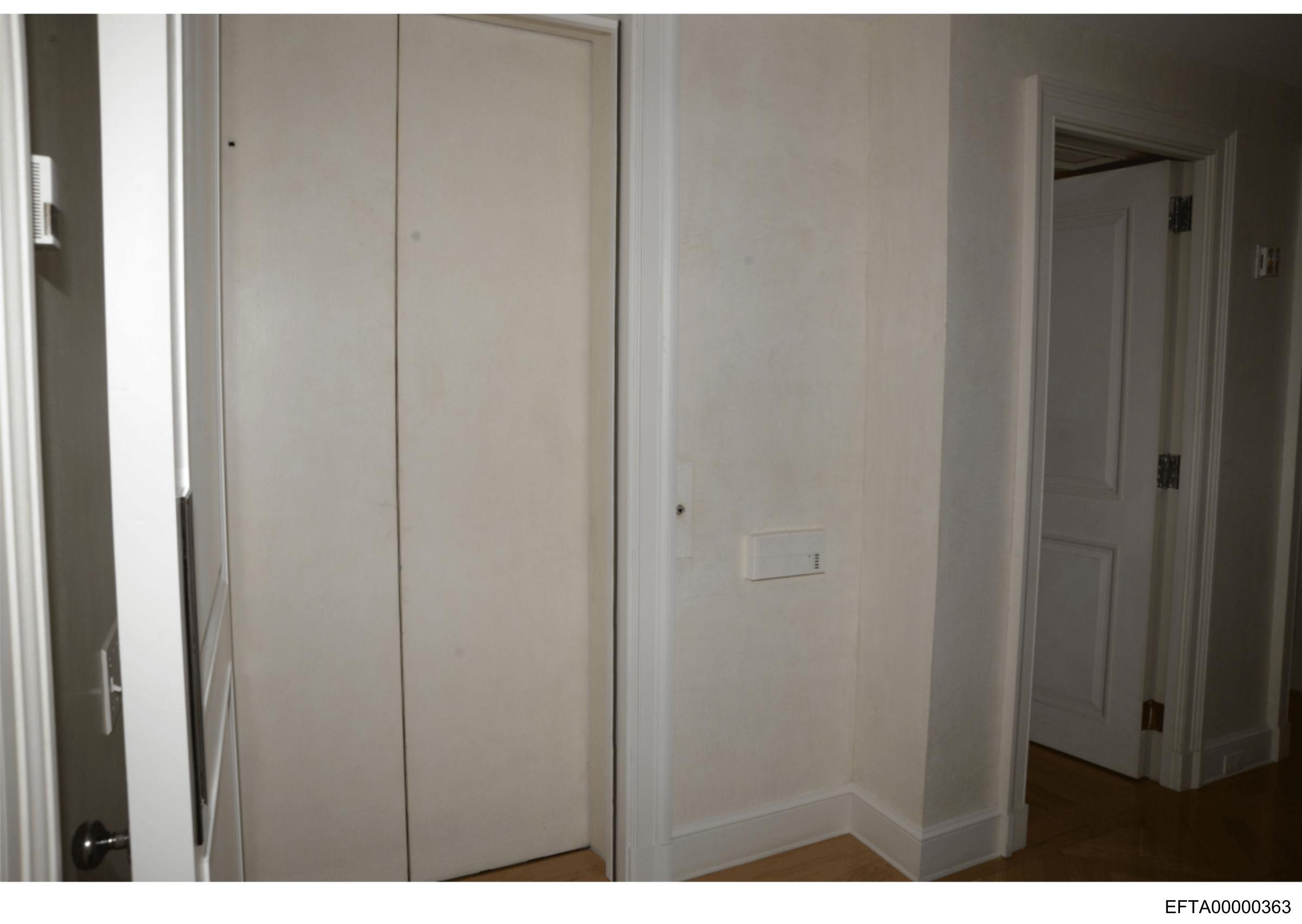 The image shows an interior room corner with a focus on two closed doors and a section of wall. The door on the left appears to be a cabinet or wardrobe, while the one on the right is partially obscured by another doorway leading to a different room. In the lower right corner of the image, there's a watermark or logo that reads "ETX" followed by what seems to be a sequence of numbers or characters. The lighting suggests it might be daytime with artificial light added inside the room.