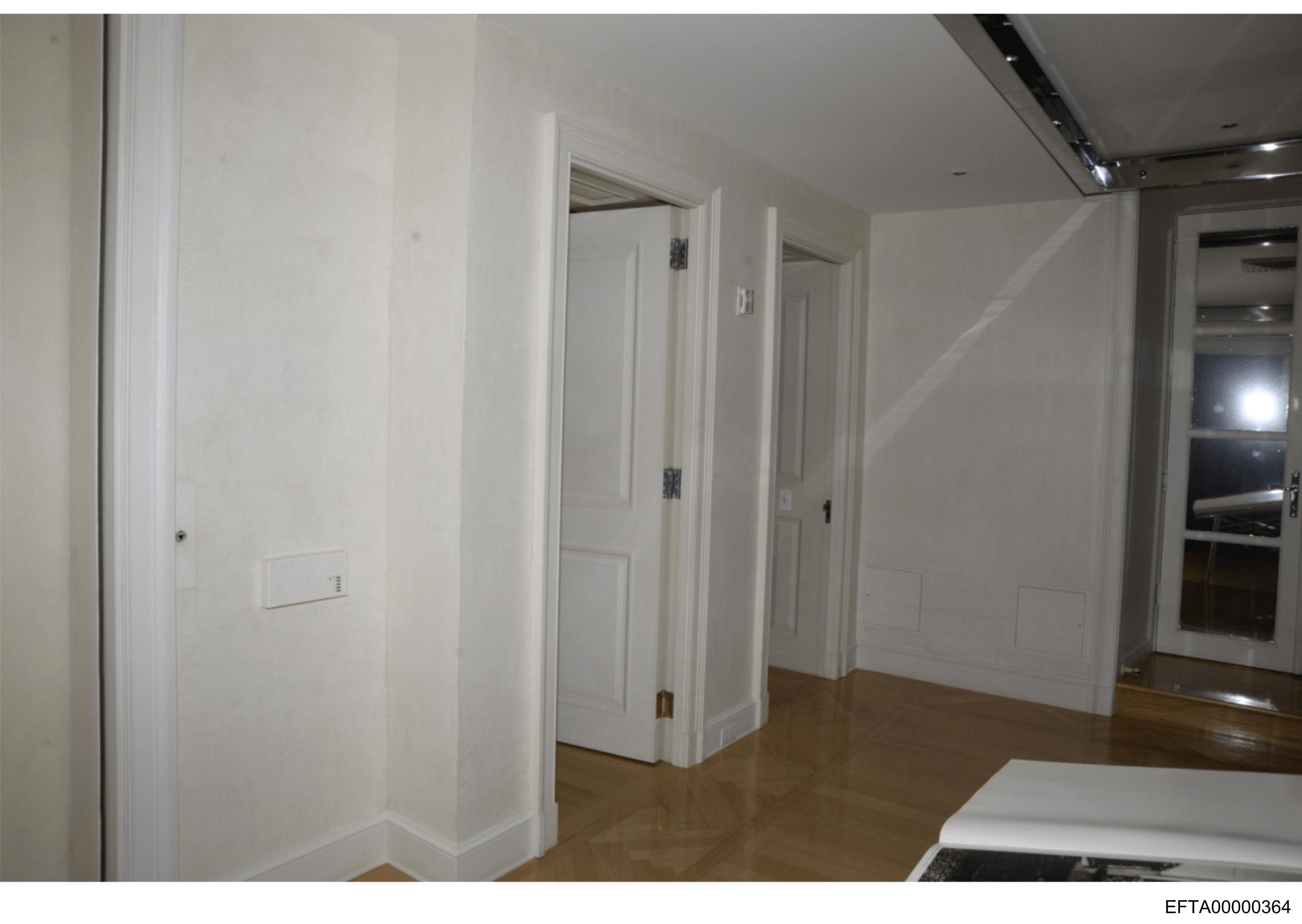 The image shows a room that appears to be undergoing renovation or construction. The walls are partially unfinished with exposed wooden studs and electrical wiring. There is one closed door on the right side of the frame. The flooring is covered by what looks like dust sheets, typically used in such projects to protect surfaces from paint, plaster, or dust. No text is visible in the image.