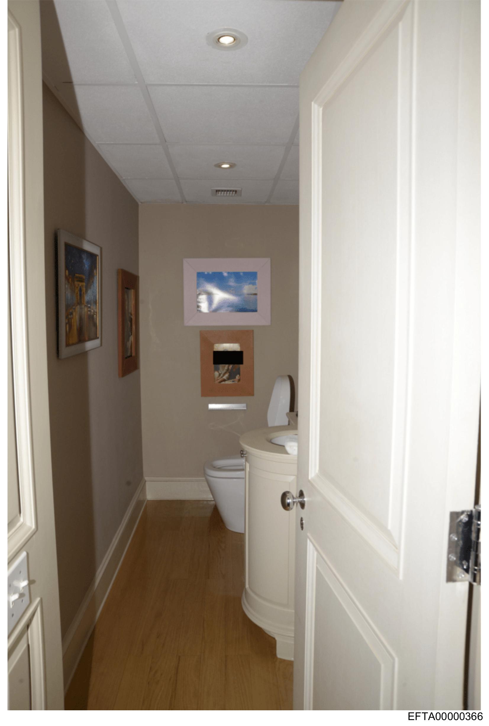 The image depicts a dimly lit hallway leading to a bathroom door that is slightly open.