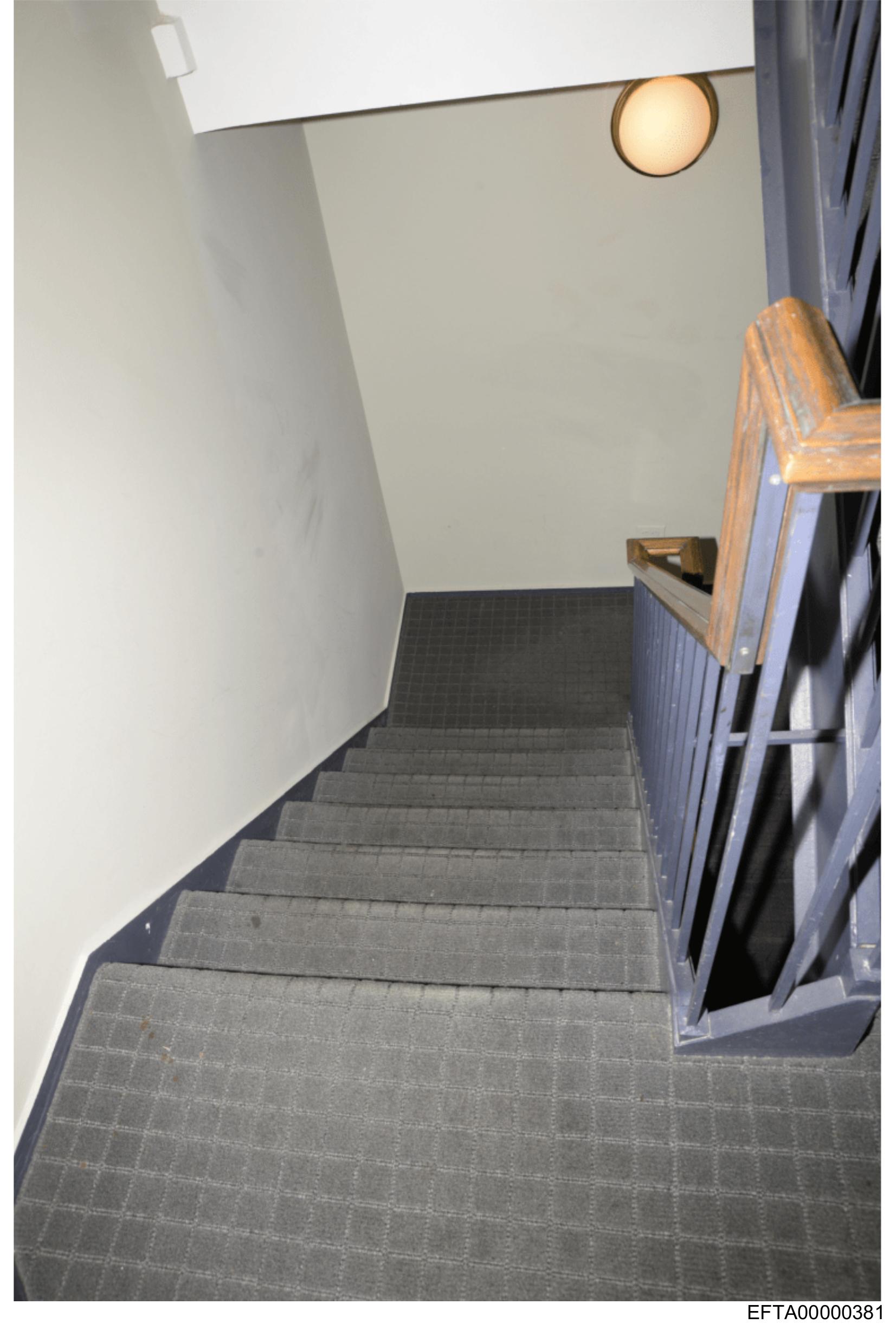The image shows a stairway viewed from the bottom, looking up.