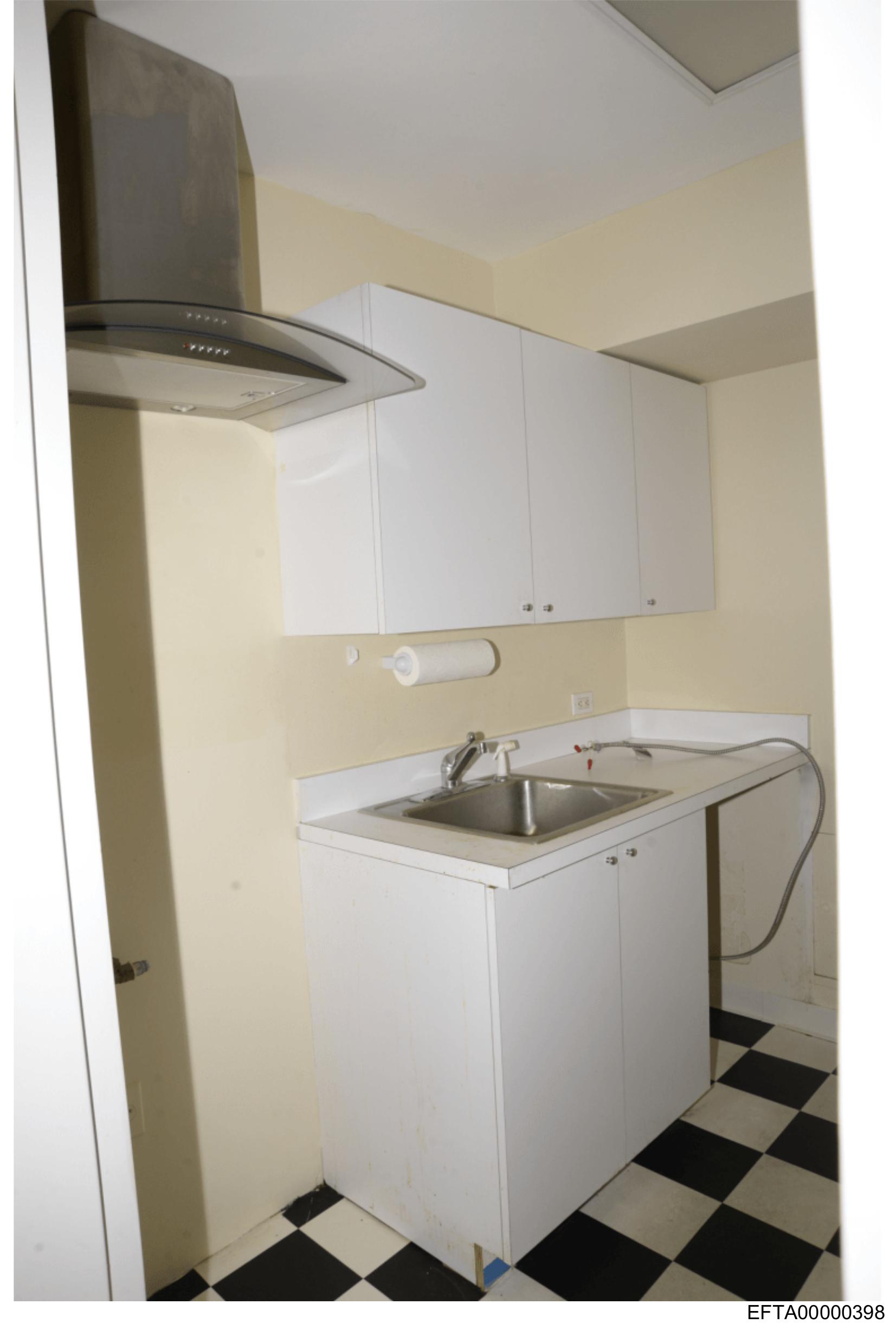 The image shows a kitchen interior with white cabinets and countertops. The cabinet doors are plain and appear to be closed. On the right side of the photo, there is a small sink installed in the countertop. Above the sink, a towel rack hangs on the wall, but no towels are visible. The floor has a black-and-white checkered pattern, typical of kitchen floors for easy cleaning and durability. There is no text or people present in the image. The style of the photo seems candid, possibly taken to show the condition or layout of the kitchen space.