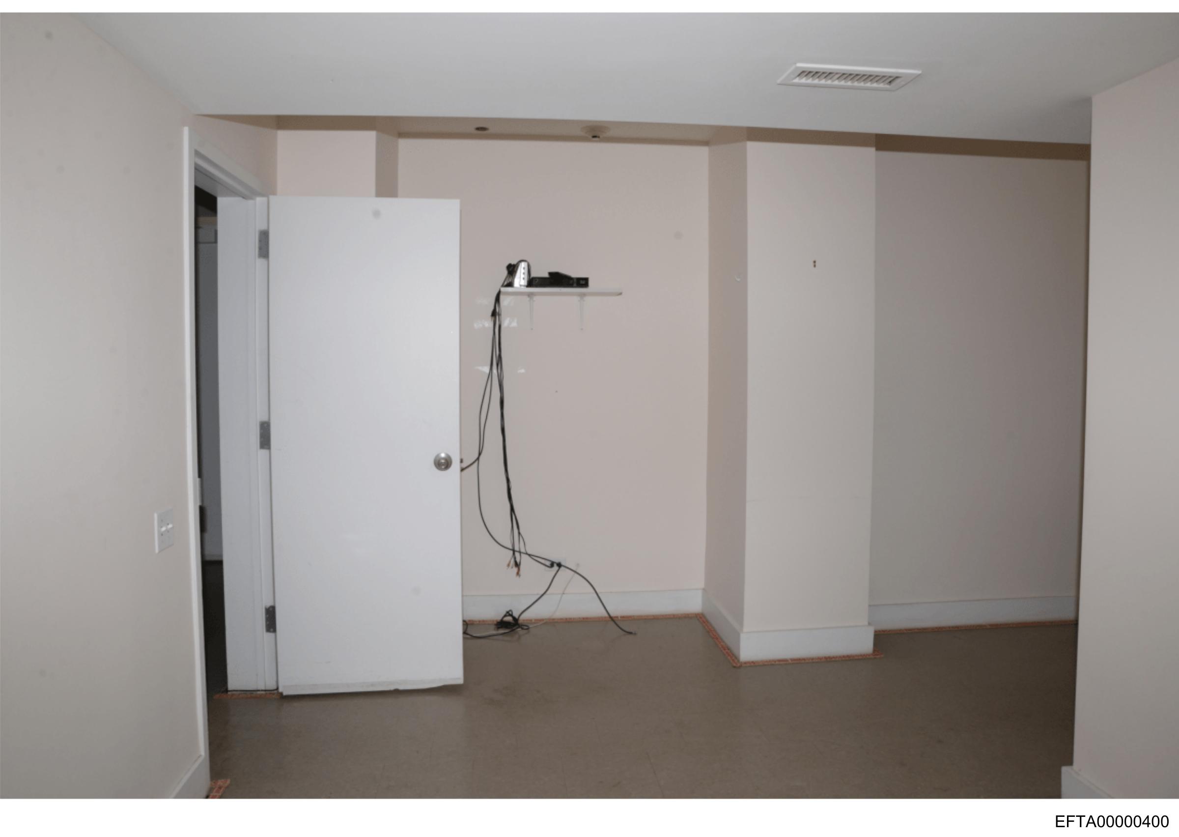 The image shows an interior space that appears to be in the process of construction or renovation. In the foreground, there is a wall with exposed pipes and wiring, which suggests unfinished work. To the left, a white door is partially open, revealing another room beyond it. The ceiling has visible air conditioning vents and electrical conduits running along its length. There are no people visible in the image. The floor looks like it could be carpeted or covered with some type of flooring material. In the lower right corner of the photo, there is a watermark or logo that reads "ETOX," but without additional context, the significance of this text is unclear. The style of the image has a grainy texture and lacks high-resolution clarity, which may indicate it was taken with a low-quality camera or device, or it could be a screen capture from an electronic device displaying a lower-resolution image.